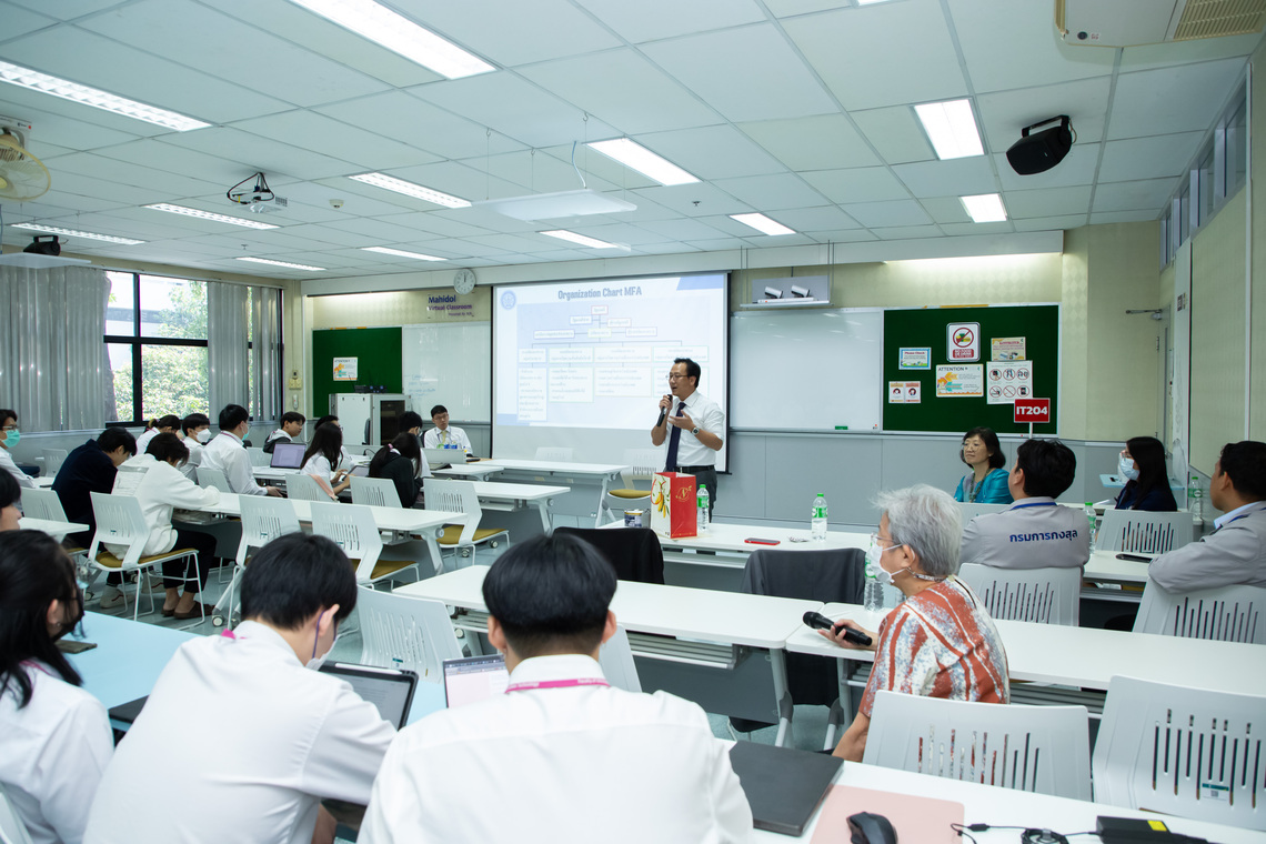 On January 31, 2024, the Faculty of Information and Communication Technology, Mahidol University (ICT Mahidol), led by Assoc. Prof. Dr. Sudsanguan Ngamsuriyaroj, Advisor to the Dean, and Dr. Tipajin Thaipisutikul, Assistant Dean for Academic Services and Technology Transfer, who are instructors of the course ITDS201 Industry Problems and Experiences 2, organized a special talk on “ICT and International Affairs: Experiences and Perspectives from Computer Scientists in the Ministry of Foreign Affairs.” On this occasion, Ms. Siriporn Supanimitwisetkul, Director of Information and Communications Technology Centre, Ms. Tarathip Saguantoy, Director of Information Systems Section, ICT Centre, Mr. Thanapoom Rimchala, Head of Consular Data and Information Centre (CDIC), Mr. Palakorn Poonperm, and Mr. Teerawut Mongkolsahakul, Computer Technical Officer, CDIC, served as the speakers. During the talk, they shared their knowledge and experiences of working in information technology at the Department of Consular Affairs, Ministry of Foreign Affairs, with second-year students of the B.Sc. in Digital Science and Technology (DST Thai Program) in Room IT204 on the 2nd floor of the Faculty of ICT, Mahidol University, Salaya.