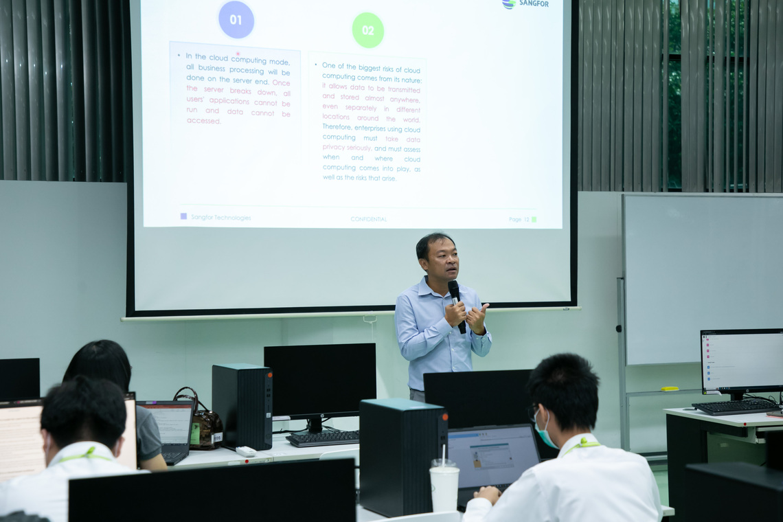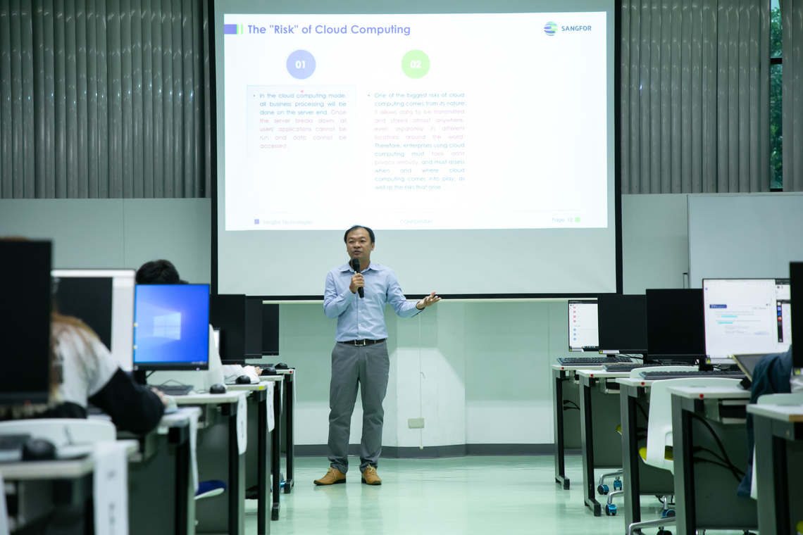 On October 16, 2023 – the Faculty of Information and Communication Technology, Mahidol University (ICT Mahidol), led by Dr. Assadarat Khurat, instructor of the course, ITDS351 Advanced Cybersecurity, organized a special talk on “Cloud Security, Network Security, and Firewall” for the 3rd year students of B.Sc. in Digital Science and Technology (DST Thai Program). On this occasion, Mr. Rakchart Ketboonlue, Solution Consultant, Sangfor Technologies (Thailand) Co., Ltd., served as the guest speaker in Computer Laboratory IT105, 1st floor, the Faculty of ICT, Mahidol, Salaya.