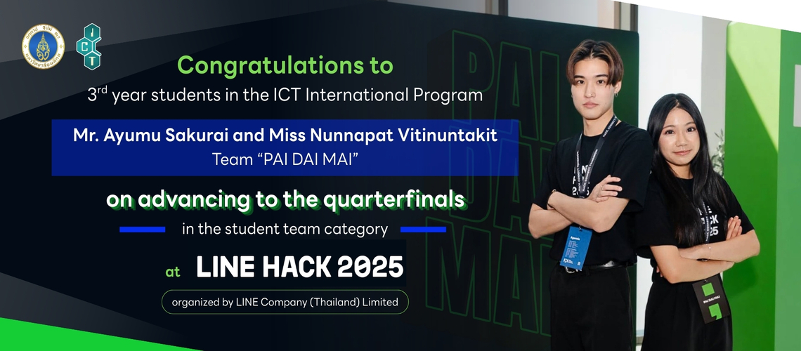 The Faculty of Information and Communication Technology, Mahidol University (ICT Mahidol), would like to extend warmest congratulations to third-year undergraduate students from the Bachelor of Science Program in Information and Communication Technology (ICT International Program), consisting of Mr. Ayumu Sakurai, and Miss Nunnapat Vitinuntakit, members of Team “PAI DAI MAI”, for advancing to the Top 8 finalist teams (Student Category) in LINE HACK 2025. The team was selected to present a solution aimed at addressing social challenges related to obstructed sidewalks, particularly those affecting elderly pedestrians and wheelchair users. The competition took place on November 29 – 30, 2025.