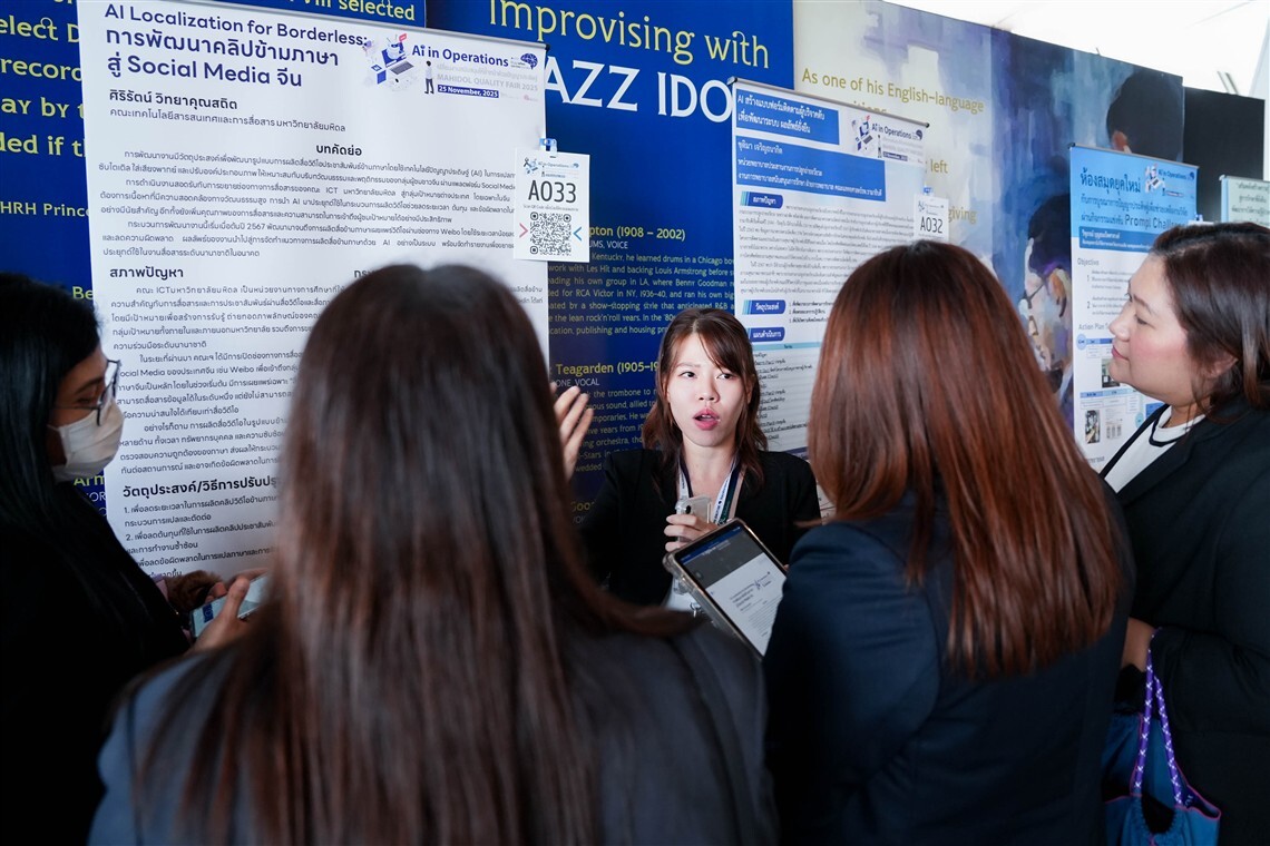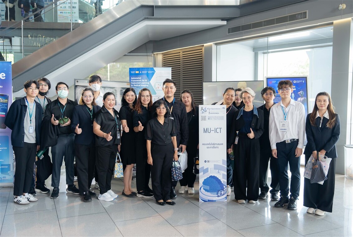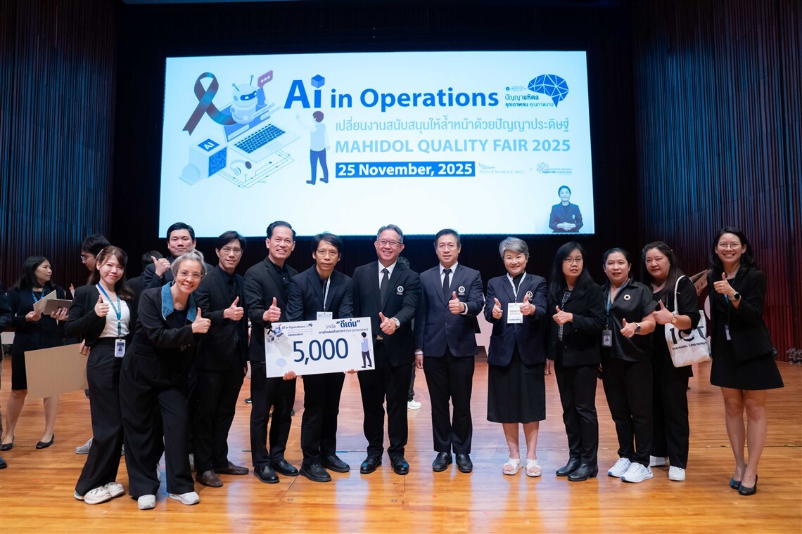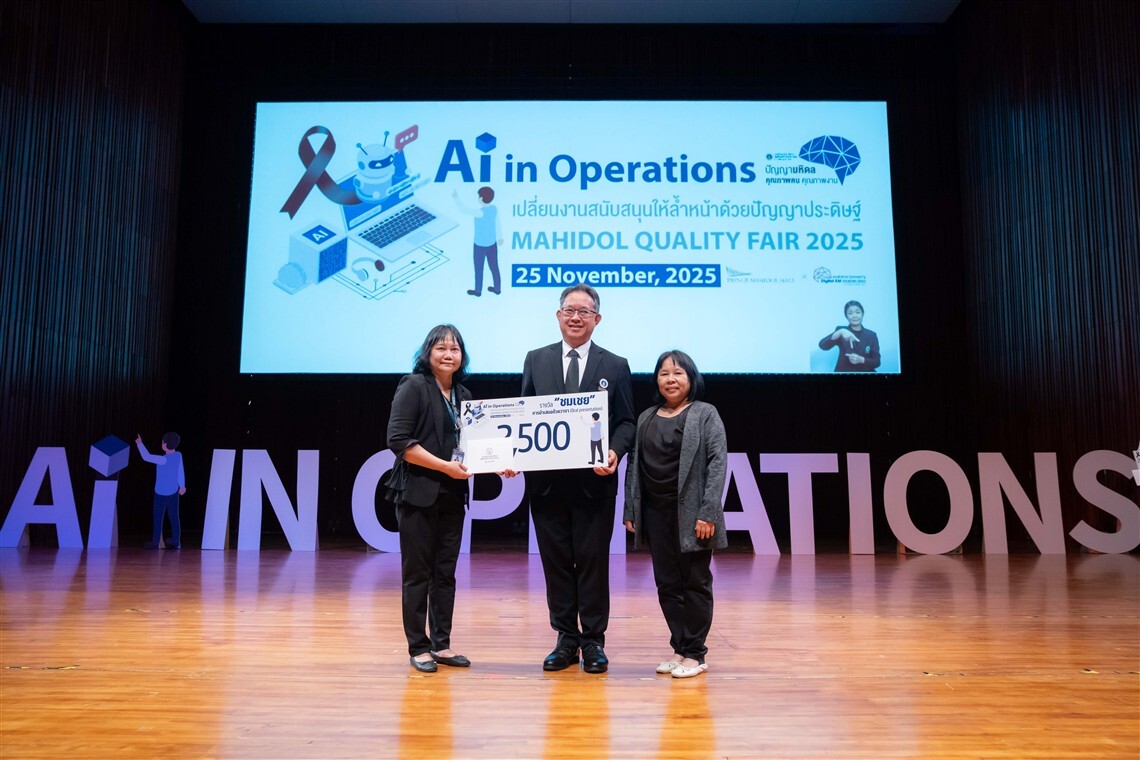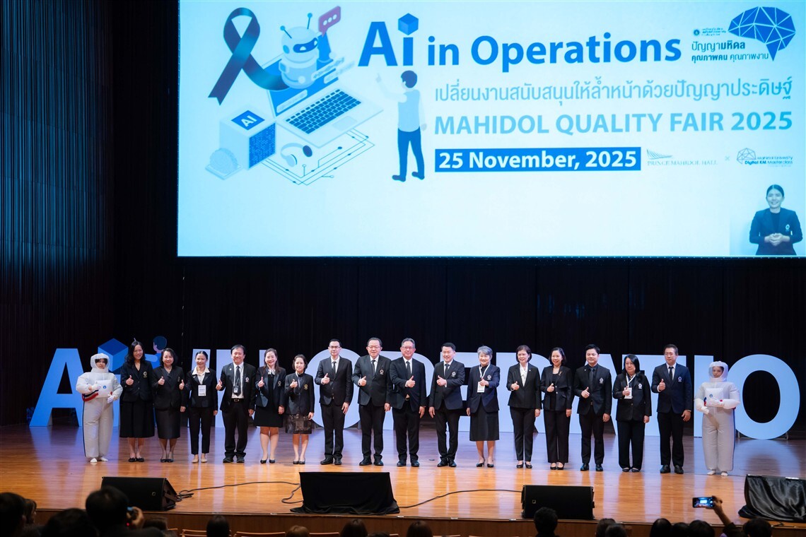 On November 25, 2025, staff members of the Faculty of Information and Communication Technology, Mahidol University (ICT Mahidol), delivered a presentation at the Mahidol Quality Fair 2025, themed “Mahidol Wisdom: Quality People, Quality Work,” under the topic “AI in Operations: Elevating Support Operations with Artificial Intelligence.” The opening ceremony was presided over by Prof. Piyamitr Sritara, MD, FRCP, President of Mahidol University, while Prof. Sompop Prathanturarug, Ph.D., Vice President for Strategic Planning, Quality Development and Social Engagement, serving as Chair of the Organizing Committee of the Mahidol Quality Fair 2025, delivered the report on the objectives of the event. The fair was held at Prince Mahidol Hall, Mahidol University, Salaya Campus, as well as online via the Mahidol University Digital KM Masterclass website.