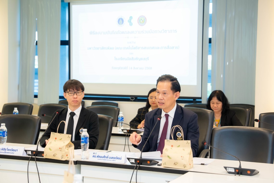 On August 14, 2025, Dr. Pattanasak Mongkolwat, Dean of the Faculty of Information and Communication Technology, Mahidol University (ICT Mahidol), signed a Memorandum of Understanding (MoU) on academic collaboration with Mr. Yutthaphong Wongmuengsan, Assistant Director of Academic Department, and Mr. Phadungsak Saengsawong, Assistant Director for Technology and Innovation Department, Assumption College Thonburi, representing the School Director. The signing ceremony was witnessed by Dr. Pisit Praiwattana, Assistant Dean for Organizational Communications and Media Technology, ICT Mahidol, as well as teachers and students from Assumption College Thonburi. The event took place at Room IT404, 4th Floor, Faculty of ICT, Mahidol University, Salaya Campus.