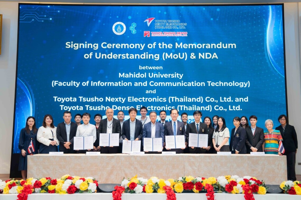On September 30, 2025, Dr. Pattanasak Mongkolwat, Dean of the Faculty of Information and Communication Technology, Mahidol University (ICT Mahidol), signed a Memorandum of Understanding (MoU) with Mr. Takeo Murata, President & Chief Executive Officer of Toyota Tsusho Nexty Electronics (Thailand) Co., Ltd. (NETH) and Mr. Tetsuya Tsukahara, President of Toyota Tsusho Denso Electronics (Thailand) Co., Ltd. (TDET). The signing ceremony, held at the Grand Auditorium, 4th Floor, Faculty of ICT, Mahidol University, Salaya Campus, was witnessed by Asst. Prof. Dr. Thanapon Noraset, Assistant Dean for Academic Affairs; Mr. Surachate Chumpol, Software Business Division Manager at NETH; and Mr. Mikio Yamazaki, Vice President at TDET, together with ICT Mahidol faculty members and the executive teams of NETH & TDET.