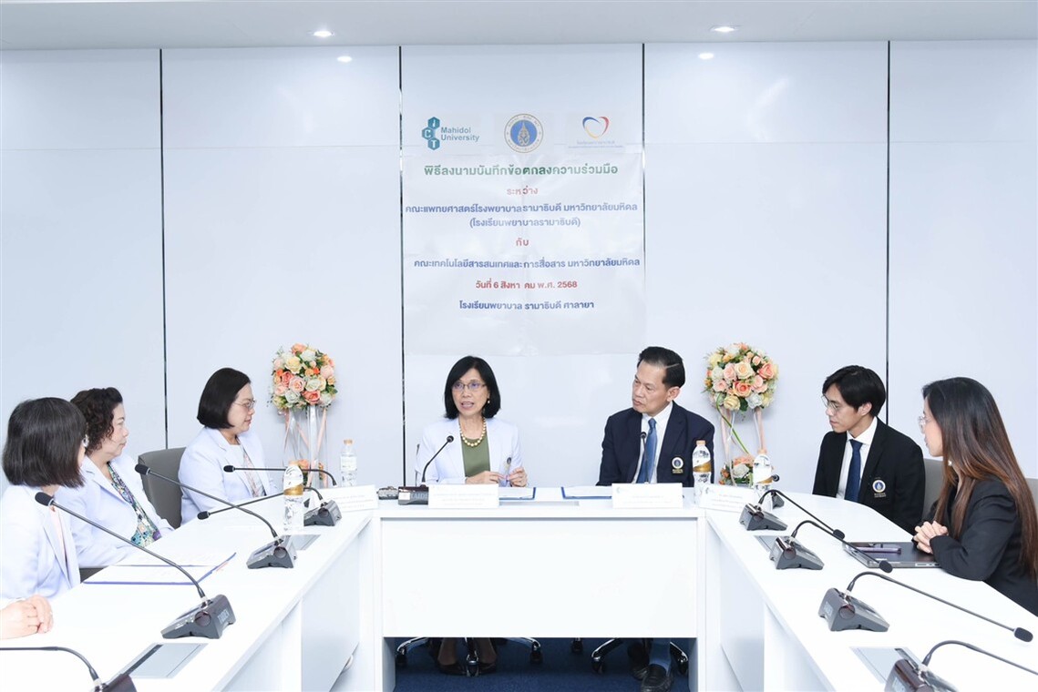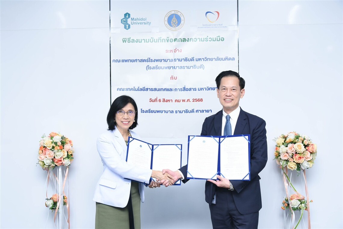 On August 6, 2025, Dr. Pattanasak Mongkolwat, Dean of the Faculty of Information and Communication Technology, Mahidol University (ICT Mahidol), signed a Memorandum of Understanding (MoU) with Assoc. Prof. Dr. Poolsuk Janepanish Visudtibhan, Director of Ramathibodi School of Nursing, Faculty of Medicine Ramathibodi Hospital, Mahidol University. The signing ceremony was witnessed by Dr. Petch Sajjacholapunt, Deputy Dean for Administration and Human Resource, and Asst. Prof. Dr. Tipajin Thaipisutikul, Assistant Dean for Academic Services and Technology Transfer at the Faculty of ICT, together with Assoc. Prof. Dr. Supreeda Monkong, Deputy Director for Graduate Studies, and staff members of the Ramathibodi School of Nursing. The event took place at Meeting Room 103, Ramathibodi School of Nursing, Faculty of Medicine Ramathibodi Hospital, Mahidol University, Salaya Campus.