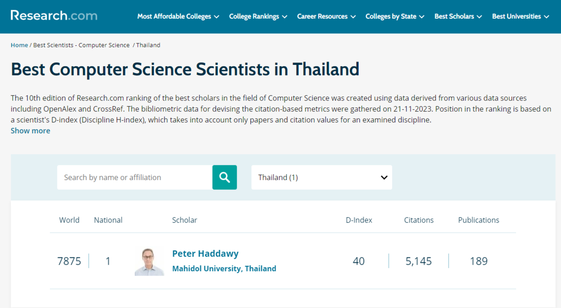 The Faculty of Information and Communication Technology, Mahidol University (ICT Mahidol) extends its congratulations to Professor Dr. Peter Haddawy, Deputy Dean for Research, for his recognition as Thailand #1 and Worldwide #7875 Scientist in the field of Computer Science,” as ranked by Research.com. This year, he achieved the #1 spot in Thailand and ranked #7875 worldwide, marking a remarkable improvement of 1,500 places from last year’s global ranking.