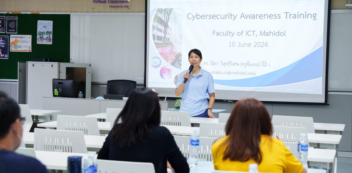 On May 28 and June 10, 2024, the Faculty of Information and Communication Technology, Mahidol University (ICT Mahidol), organized a training program, “Security Awareness” for its staff. On this occasion, Assoc. Prof. Dr. Vasaka Visoottiviseth, an instructor of the Computer Science Academic Group and Program Chair of the M.Sc. in Cyber Security and Information Assurance, served as the speaker. During the training, she shared knowledge on Cybersecurity and Security Awareness to ensure that the faculty staff are aware of cyber threats and have the necessary cybersecurity skills and knowledge. The training took place in room IT204, 2nd floor, ICT Building, Mahidol University, Salaya.