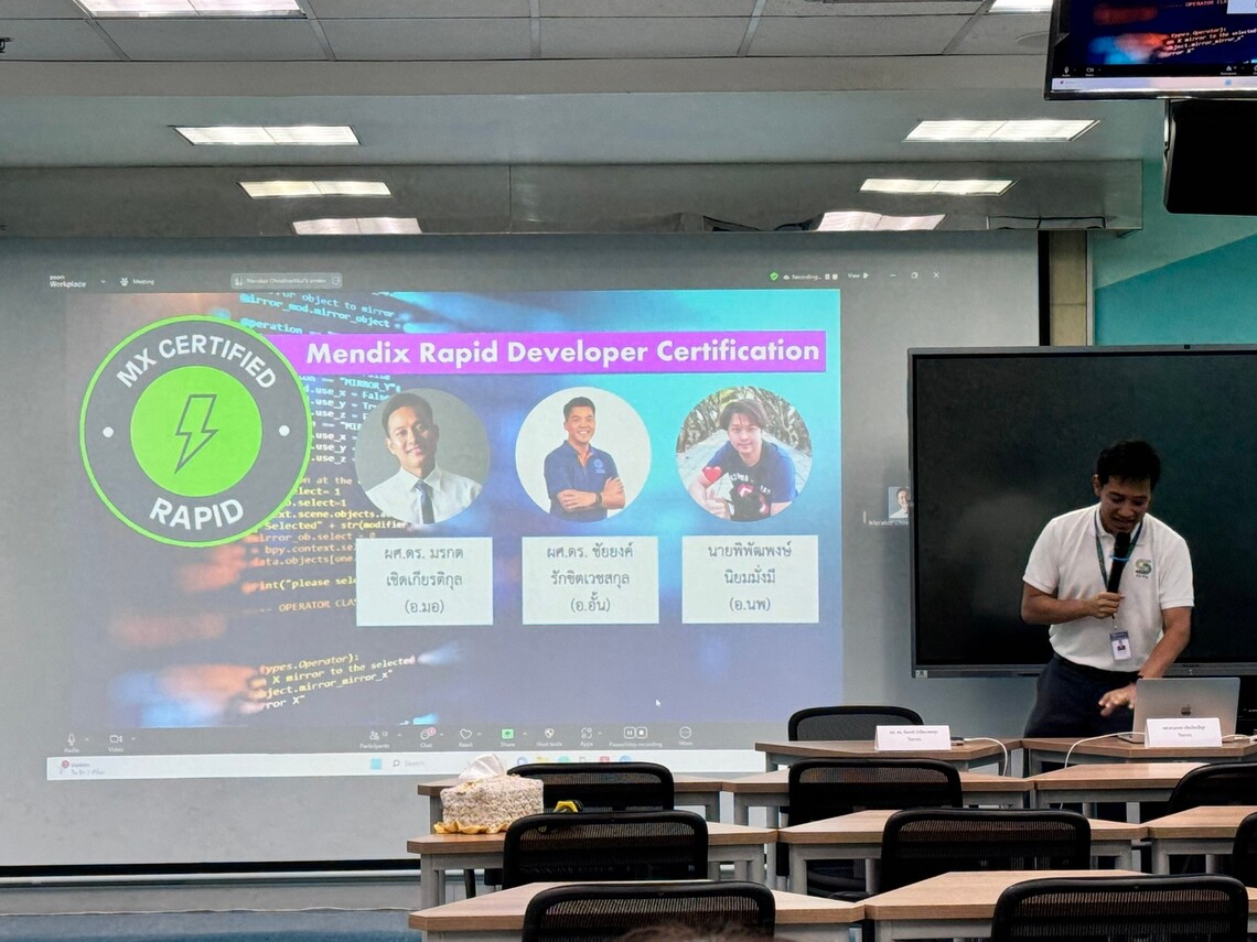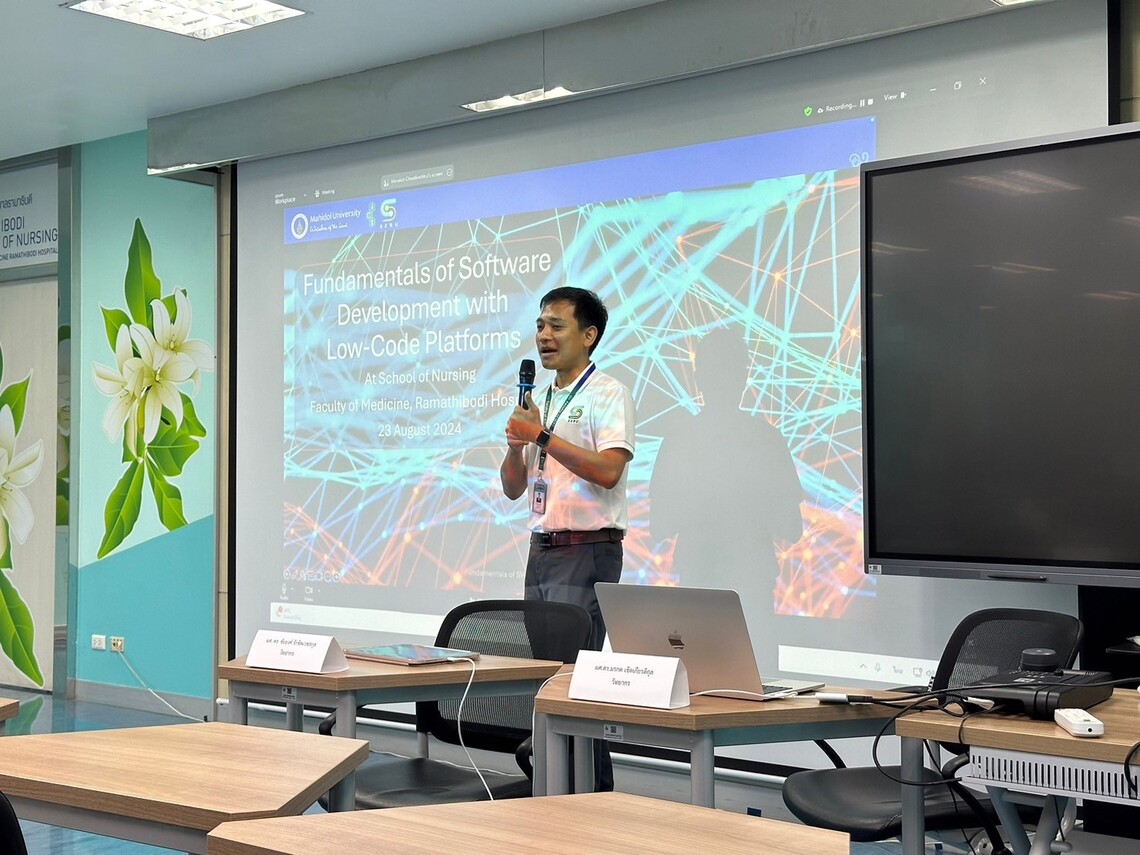 On August 23, 2024, the Faculty of Information and Communication Technology (ICT Mahidol), led by Asst. Prof. Dr. Morakot Choetkiertikul, along with Asst. Prof. Dr. Chaiyong Ragkhitwetsagul, Instructors of the Computer Science Group and Software Engineering and Business Analytics Research Clusters (SEBA), as well as Mr. Pipatpong Niyommungmee, Computer Technical Officer from the Technology Infrastructure Department, served as speakers at a workshop titled “Fundamentals of Software Development with Low-Code Platforms.” The session was held for instructors from the Division of Community Health Nursing, Ramathibodi School of Nursing, Faculty of Medicine Ramathibodi Hospital, in Room 617, 6th floor, Medical Learning and Laboratory Building, Ramathibodi School of Nursing, Mahidol University.