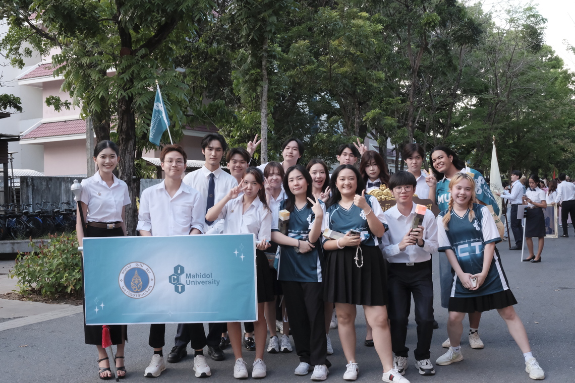 On March 12, 2025, students from the Bachelor of Science in Information and Communication Technology (ICT International Program) and the Bachelor of Science in Digital Science and Technology (DST Thai Program) at the Faculty of Information and Communication Technology, Mahidol University (ICT Mahidol), joined the parade at the opening ceremony of the Mahidol University Student Sports Competition, “Chor Kan Phai Games 2024.”