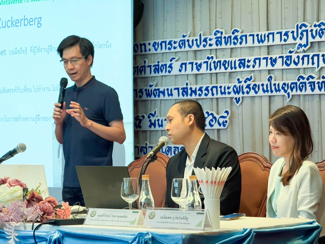 On March 23, 2025, the Faculty of Information and Communication Technology, Mahidol University (ICT Mahidol), led by Asst. Prof. Dr. Mores Prachyabrued, Program Director of M.Sc. in Game Technology and Gamification, and Director of ImmerSense Laboratory, along with Miss Sirirat Wittayakunsatid, Audio-Visual Technical Officer from the Audio Visual and Digital Learning Media Development Department; Mr. Chalermpol Phuwatadisit from Division of Information Technology (MUIT), Office of the President, Mahidol University; and Mr. Sibsan Suksuchano, a special expert in Computer Science from the Department of Computational Science and Digital Technology, Faculty of Liberal Arts and Science, Kasetsart University, served as guest speakers for the training program “Technology and AI for Education: Enhancing the Efficiency of Teaching and Learning in Science, Mathematics, Thai Language, and English with Technology and Artificial Intelligence (AI) for the Development of Digital-Age Learners, Batch 2.”