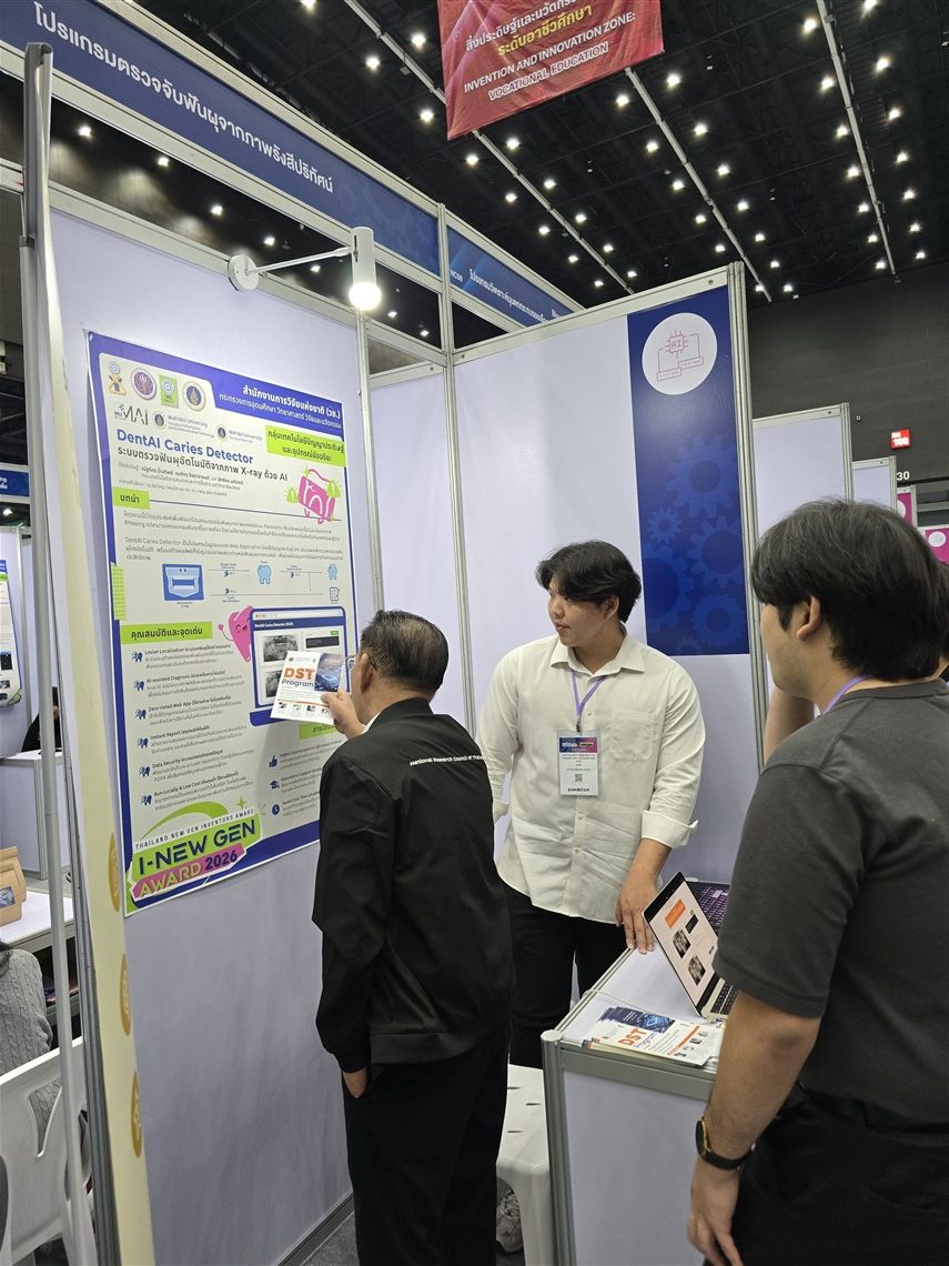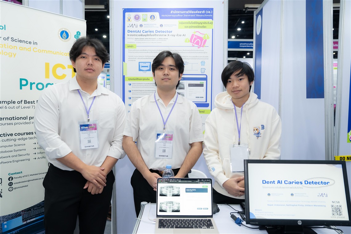 In addition, fourth-year students from the Bachelor of Science Program in Information and Communication Technology (ICT International Program)—Mr. Sittikorn Maneewong, Mr. Napat Jirataranon, and Mr. Natthaphat Pintip—participated in the presentation of youth-level inventions and innovations under the project titled “Thailand New Gen Inventors Award 2026” (I–New Gen Award 2026), at the higher education level, in the Artificial Intelligence and Smart Devices category. The students presented their work, “Dental Caries Detection System for Panoramic Radiographs.” The project was supervised by Dr. Sirawich Vachmanus, an instructor in the Computer Science Academic Group, and Assoc. Prof. Dr. Suchaya Damrongsri, Deputy Dean for Quality Development, Faculty of Dentistry, Mahidol University.