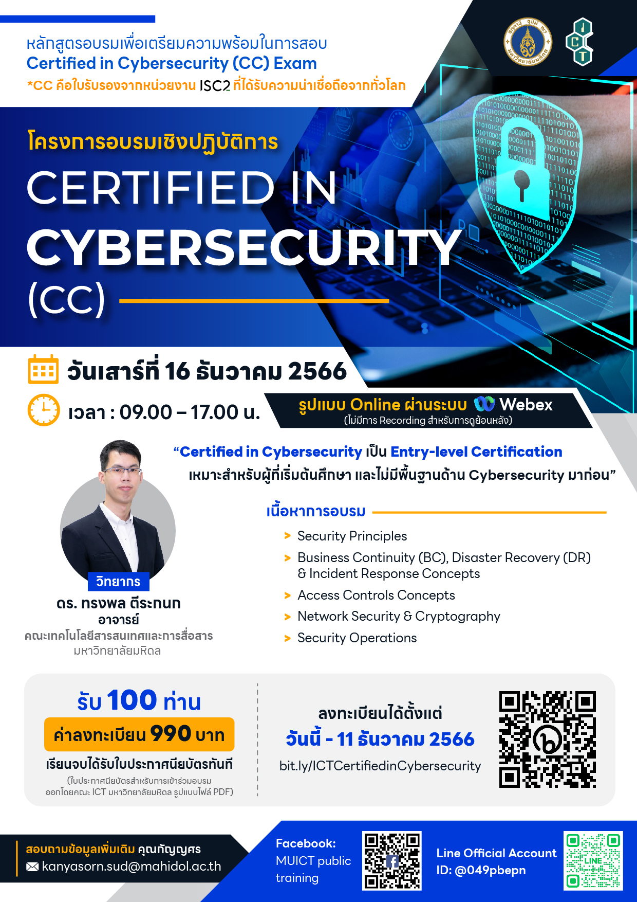 หลักสูตรอบรมเพื่อเตรียมความพร้อมในการสอบ Certified in Cybersecurity (CC) Exam ซึ่งเป็น Certification Exam ที่ออกโดยหน่วยงาน ISC2 ที่ได้รับความเชื่อถือจากทั่วโลก โดย Certified in Cybersecurity (CC) Exam เป็น Entry-level Certification เหมาะสำหรับผู้ที่เริ่มต้นศึกษา และไม่มีพื้นฐานด้าน Cybersecurity มาก่อน
