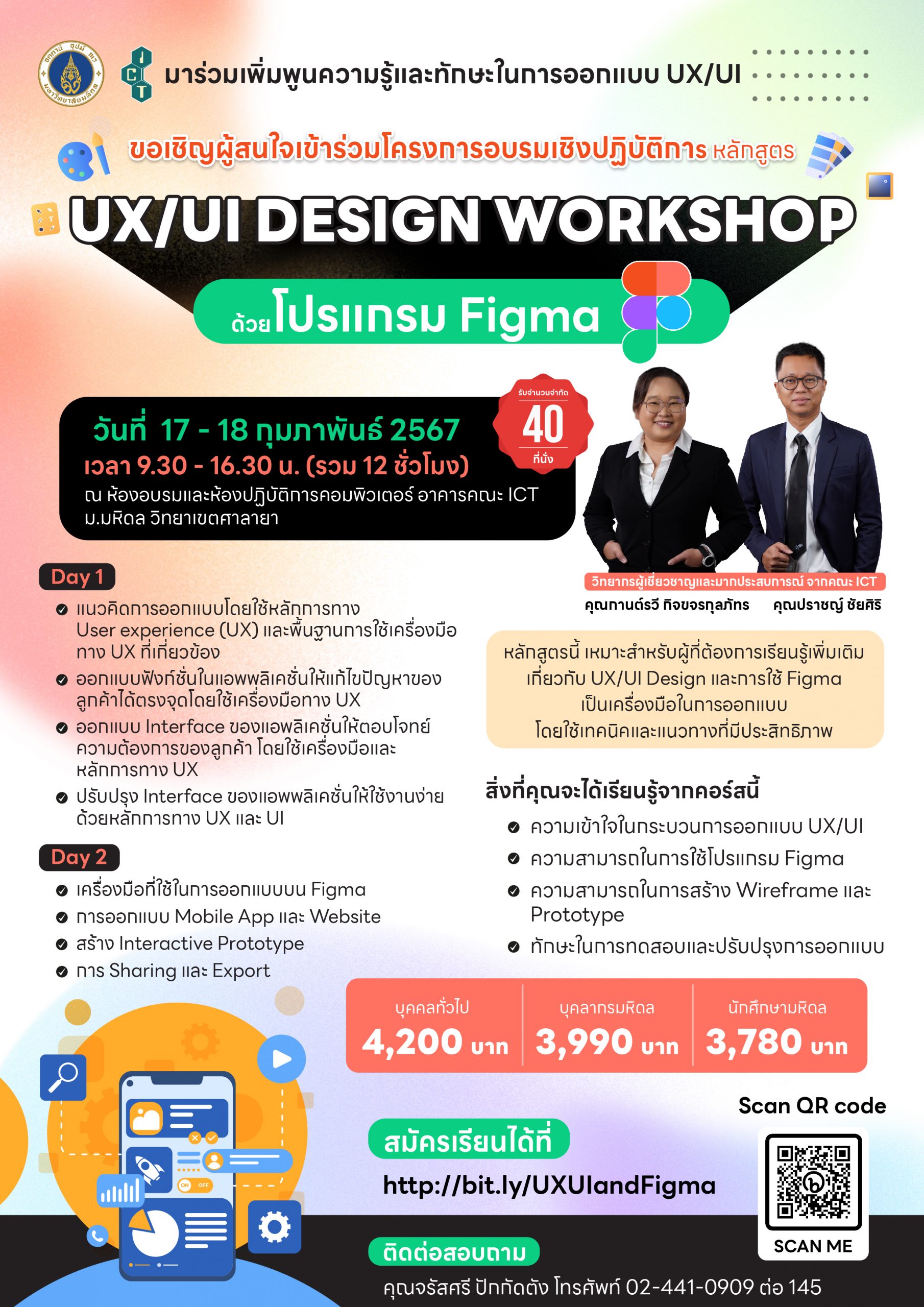 หลักสูตร UX/UI Design Workshop ด้วยโปรแกรม Figma เป็นหลักสูตรที่จัดขึ้นเพื่อตอบสนองต่อความต้องการในตลาดงาน เนื่องจากในปัจจุบันมีความต้องการในการออกแบบประสบการณ์ผู้ใช้ (UX) และออกแบบอินเตอร์เฟซ (UI) ที่มีคุณภาพสูง มีความเข้าใจในการใช้งานง่าย และสอดคล้องกับความต้องการของผู้ใช้จริง การจัดอบรมครั้งนี้ เน้นการเรียนการสอนเพื่อเพิ่มทักษะและความรู้ในการออกแบบ UX และ UI ให้กับผู้เรียน โดยการใช้โปรแกรม Figma เป็นเครื่องมือหลัก ผ่านการลงมือปฏิบัติจริง ได้แก่