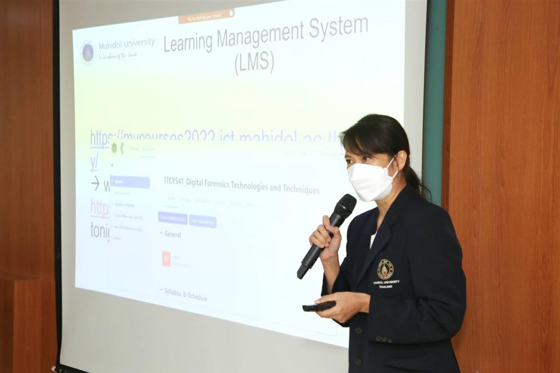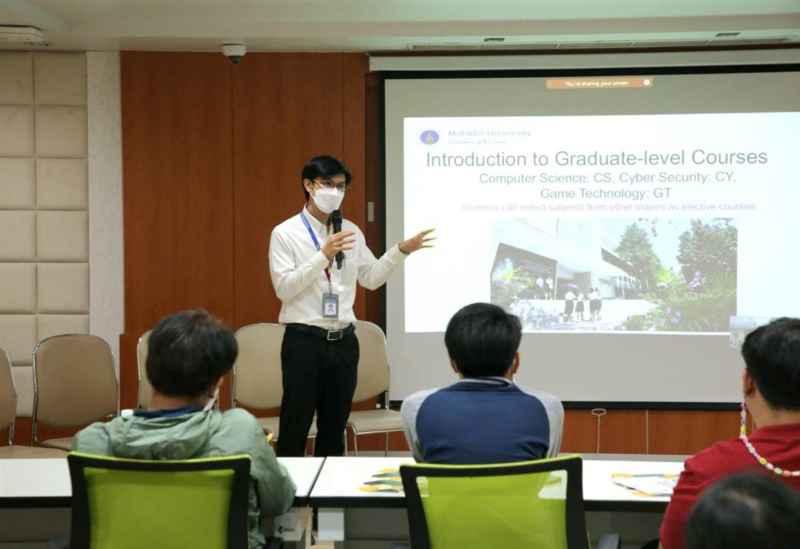จากนั้น รองศาสตราจารย์ ดร.วรพันธ์ คู่สกุลนิรันดร์ อาจารย์ประจำกลุ่มวิชาวิทยาการคอมพิวเตอร์ แนะนำการเรียนการสอนที่คณะ ICT ดร. ธนพล นรเสฏฐ์ ผู้ช่วยคณบดีฝ่ายพัฒนาวิชาการและหลักสูตร กล่าวแนะนำรายวิชาในแต่ละหลักสูตร และรองศาสตราจารย์ ดร. วัสกา วิสุทธิวิเศษ ประธานหลักสูตรวิทยาศาสตรมหาบัณฑิต สาขาวิชาความมั่นคง ไซเบอร์และการประกันสารสนเทศ กล่าวแนะนำฐานข้อมูลออนไลน์เพื่อการวิจัยและวิชาการ ส่วนในช่วงสุดท้ายเป็นการแนะนำหลักสูตร จำนวน 4 หลักสูตร ดังนี้