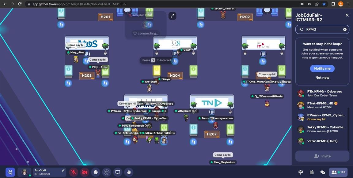 วันที่ 30 มีนาคม 2565 คณะเทคโนโลยีสารสนเทศและการสื่อสาร (ICT) มหาวิทยาลัยมหิดล จัดกิจกรรม ICT Mahidol Job and Education Fair #13 (รอบที่ 2) โดยได้รับเกียรติจาก ดร.พัฒนศักดิ์ มงคลวัฒน์ คณบดี กล่าวเปิดงานในรูปแบบ Live Broadcast ผ่านแพลตฟอร์มออนไลน์เสมือนจริง Gather.Town โดยมีบริษัทชั้นนำด้าน IT และสถาบันการศึกษาชั้นนำ เข้าร่วมกิจกรรมกว่า 60 แห่ง