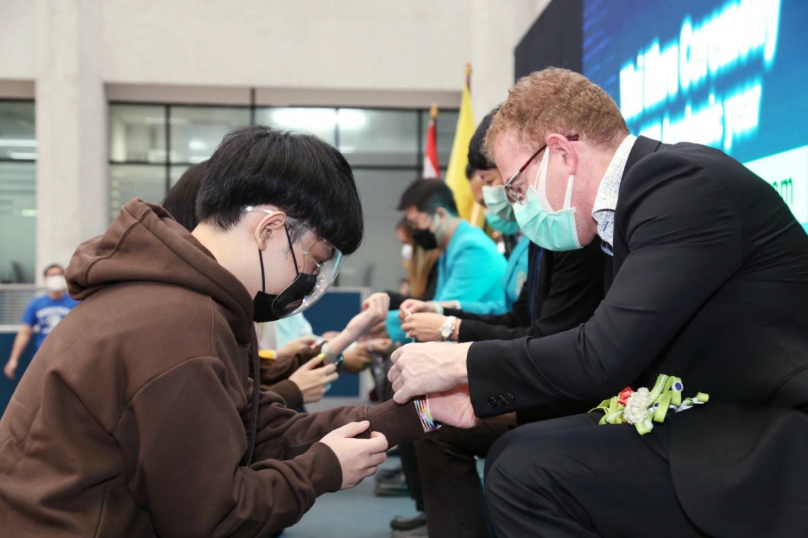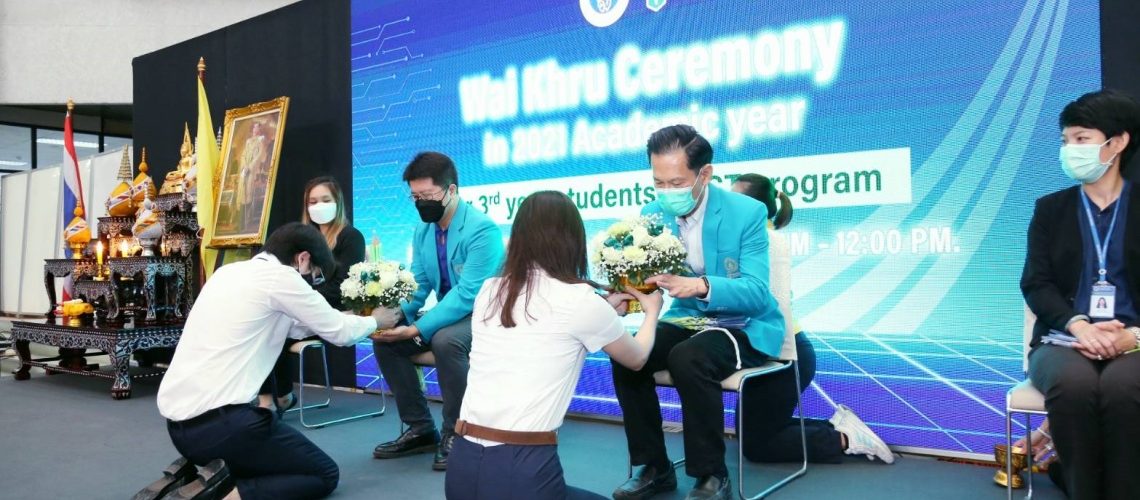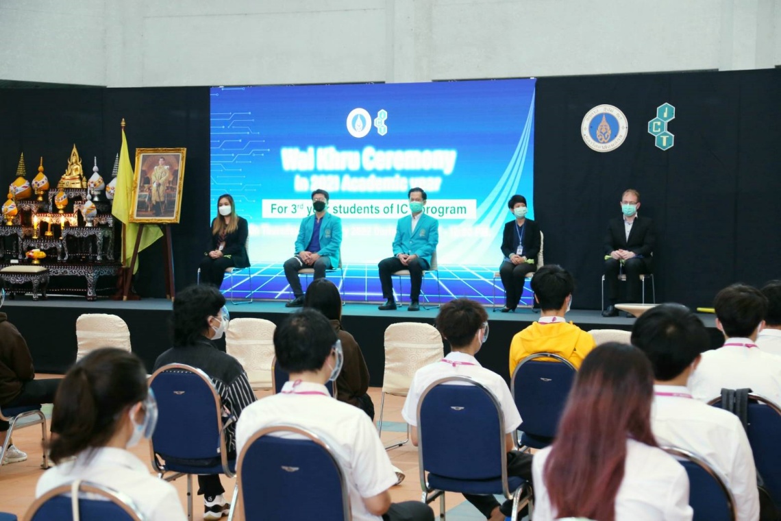 วันที่ 17 กุมภาพันธ์ 2565 คณะเทคโนโลยีสารสนเทศและการสื่อสาร (ICT) มหาวิทยาลัยมหิดล จัดพิธีไหว้ครู ปี การศึกษา 2564 และมอบสายชั้นปีให้กับนักศึกษาชั้นปีที่ 3 หลักสูตรวิทยาศาสตรบัณฑิต สาขาวิชาเทคโนโลยีสารสนเทศและการสื่อสาร (ICT หลักสูตรนานาชาติ) โดยได้รับเกียรติจาก ดร.พัฒนศักดิ์ มงคลวัฒน์ คณบดีคณะ ICT เป็นประธานเปิดพิธีฯ พร้อมด้วยคณะผู้บริหาร คณาจารย์ประจำคณะ และนักศึกษาระดับปริญญาตรี ชั้นปี 3 เข้าร่วมงานพิธีดังกล่าวฯ ในรูปแบบ onsite ณ ลาน Innovative Space คณะ ICT มหาวิทยาลัยมหิดล ศาลายา และรูปแบบออนไลน์ ผ่านโปรแกรม Webex Meetings