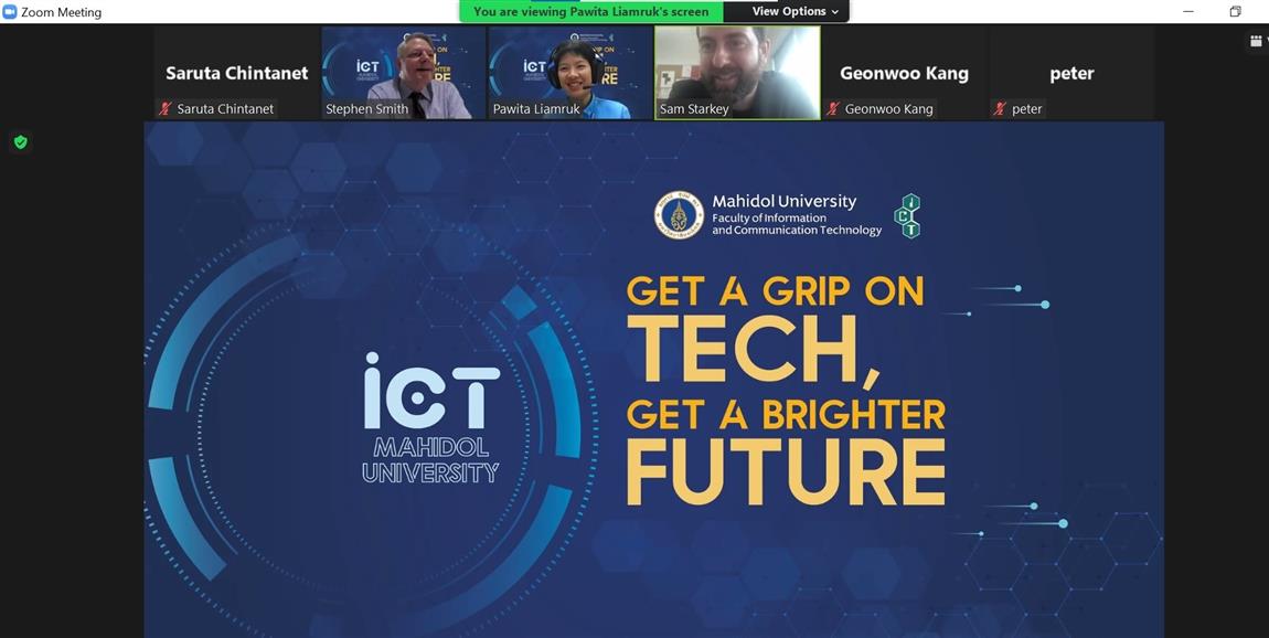 วันที่ 29 เมษายน 2565 คณะเทคโนโลยีสารสนเทศและการสื่อสาร (ICT) มหาวิทยาลัยมหิดล นำโดย ดร.ปวิตรา เลี่ยมรักษ์ รองคณบดีฝ่ายบริหารการศึกษา และรักษาการแทนรองคณบดีฝ่ายสื่อสารองค์กรและสร้างความผูกพัน พร้อมด้วย Mr. Stephen Smith, Student and Alumni Engagement Officer ร่วมบรรยายให้ความรู้เกี่ยวกับเทรนด์เทคโนโลยีของปี 2022 และแนะนำหลักสูตรวิทยาศาสตรบัณฑิต สาขาเทคโนโลยีสารสนเทศและการสื่อสาร (ICT นานาชาติ) ในหัวข้อ “Cutting Edge Technology & Careers in IT” ภายใต้งาน ISPP Virtual Career Talk ให้แก่นักเรียน Grade 10 – 12 โรงเรียน International School of Phnom Penh ประเทศกัมพูชา ในรูปแบบออนไลน์ผ่านโปรแกรม Zoom