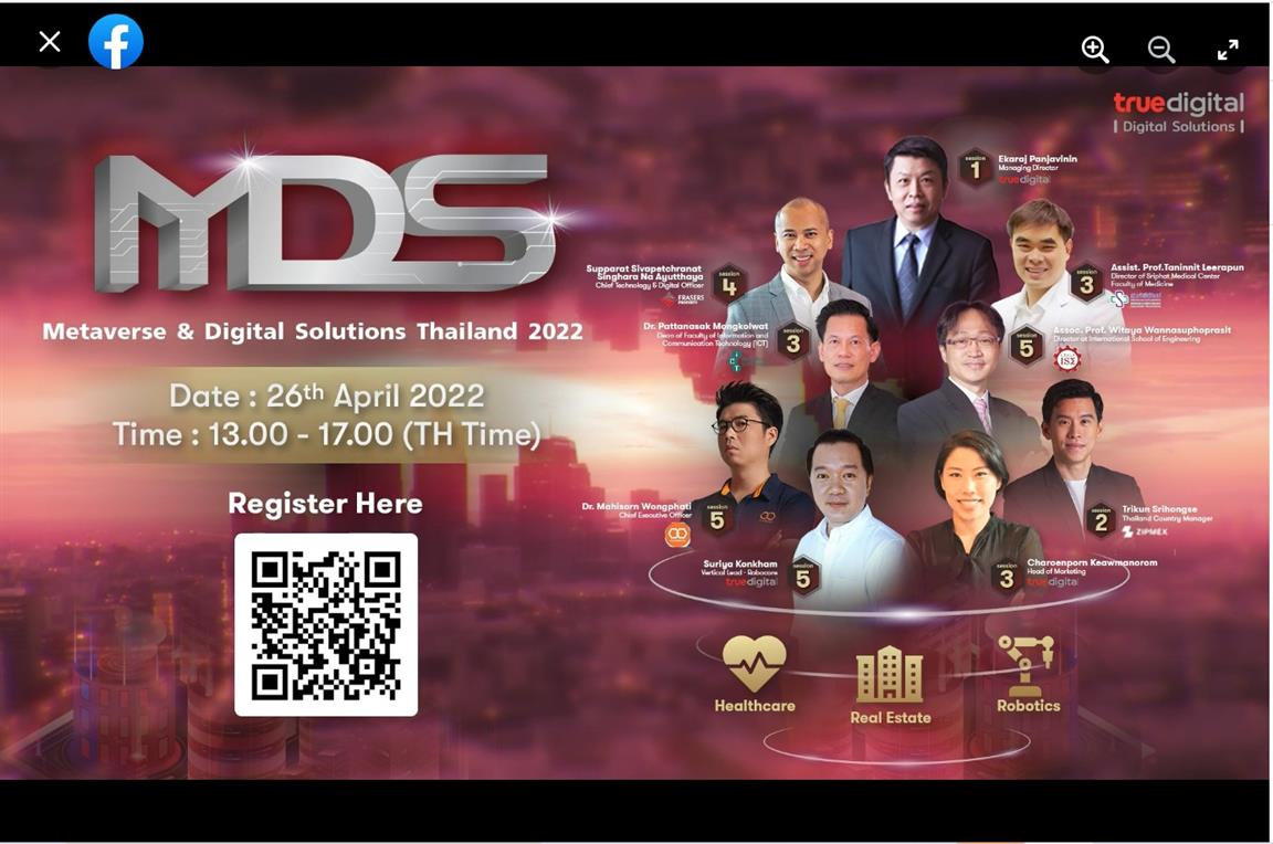 วันที่ 26 เมษายน 2565 ดร.พัฒนศักดิ์ มงคลวัฒน์ คณบดี คณะเทคโนโลยีสารสนเทศและการสื่อสาร (ICT) มหาวิทยาลัยมหิดล ได้รับเชิญจากบริษัท ทรู ดิจิทัล กรุ๊ป จำกัด ให้เป็นวิทยากรเสวนาในงานสัมมนา “Metaverse & Digital Solutions Thailand 2022” ช่วงการแพทย์ ในหัวข้อ “Metaverse & Healthcare: the Rise of Metaverse in Healthcare. Is healthcare in Thailand ready for Metaverse?” ร่วมกับ คุณปริวรรต วงษ์สำราญ ผู้อำนวยการฝ่ายพัฒนาผู้ประกอบการนวัตกรรม สำนักงานนวัตกรรมแห่งชาติ (NIA) และผศ.นพ.ธนินนิตย์ ลีรพันธ์ ผู้อำนวยการศูนย์ความเป็นเลิศทางการแพทย์ คณะแพทยศาสตร์ มหาวิทยาลัยเชียงใหม่ โดยมีคุณเจริญพร แก้วมโนรมย์ Head of Channel and Marketing บริษัท ทรู ดิจิทัล กรุ๊ป เป็นพิธีกร ร่วมเสวนาและแชร์ประสบการณ์เกี่ยวกับการนำเทคโนโลยีดิจิทัลมาใช้เพื่อเพิ่มประสิทธิภาพทางด้านการแพทย์ และปัจจัยในการขับเคลื่อน Metaverse ในอุตสาหกรรมด้านการแพทย์ ในรูปแบบ Virtual Conference ผ่าน Facebook Live: True Digital Solutions