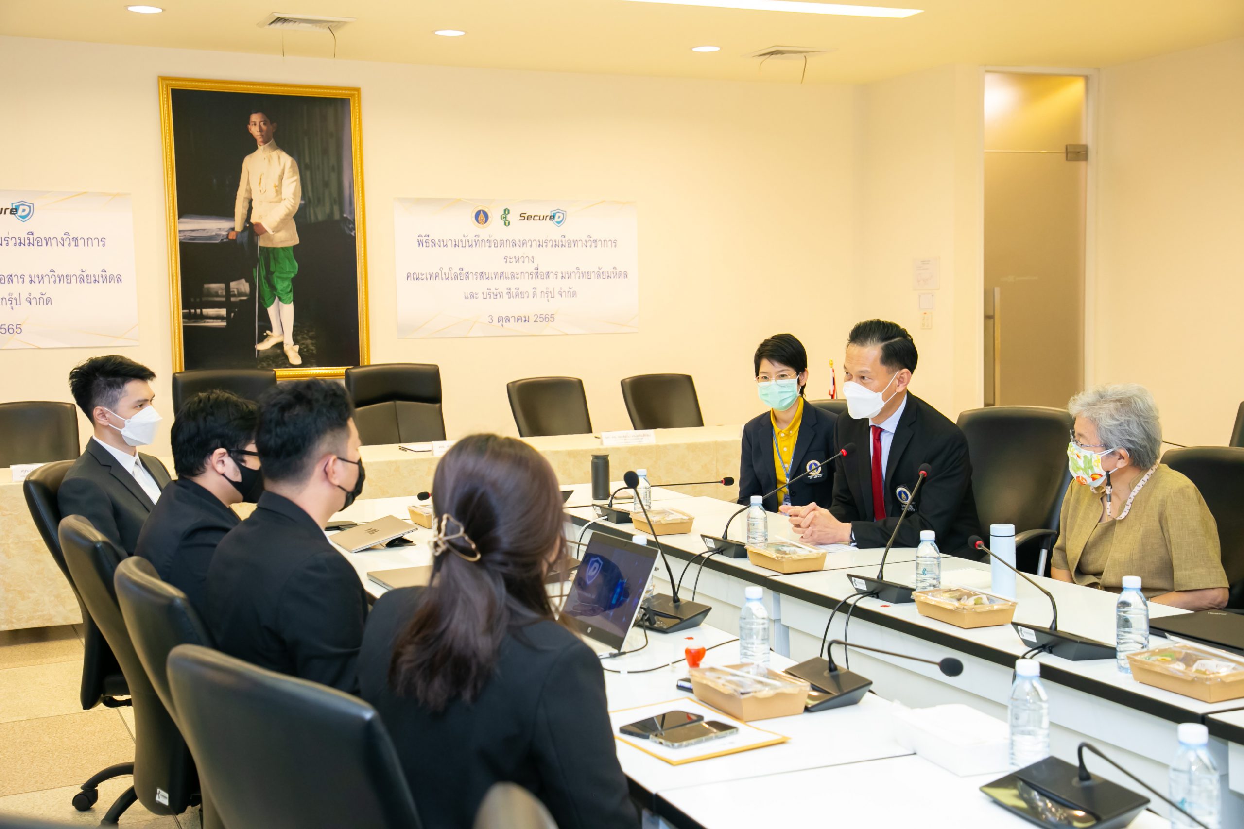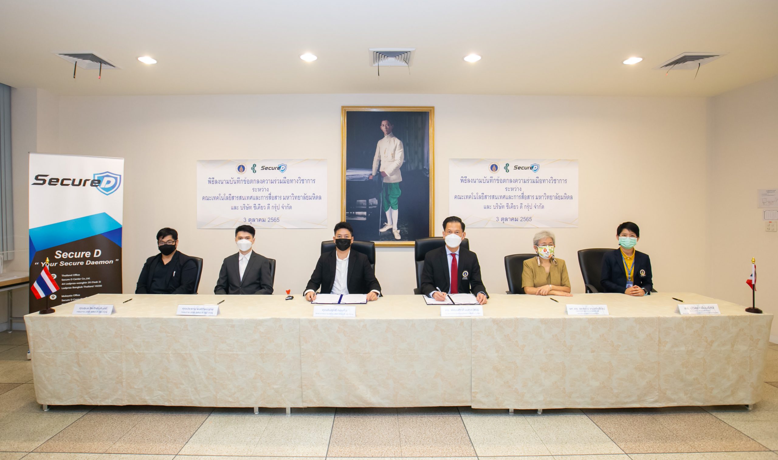 วันที่ 3 ตุลาคม 2565 ดร. พัฒนศักดิ์ มงคลวัฒน์ คณบดี คณะเทคโนโลยีสารสนเทศและการสื่อสาร มหาวิทยาลัยมหิดล (ICT) ร่วมลงนามบันทึกข้อตกลงความร่วมมือทางวิชาการ (MoU) กับคุณอัมฤทธิ์ ทองทั่ว ประธานกรรมการบริหาร บริษัท ซีเคียว ดี กรุ๊ป จำกัด และศิษย์เก่าหลักสูตรวิทยาศาสตรมหาบัณฑิต สาขาวิชา ความมั่นคงไซเบอร์และการประกันสารสนเทศ โดยมี ดร.ปวิตรา เลี่ยมรักษ์ รองคณบดีฝ่ายบริหารการศึกษา และรักษาการแทนรองคณบดีฝ่ายสื่อสารองค์กรและสร้างความผูกพัน รองศาสตราจารย์ ดร. สุดสงวน งามสุริยโรจน์ ประธานหลักสูตรวิทยาศาสตรบัณฑิต สาขาวิชาวิทยาการและเทคโนโลยีดิจิทัล รองศาสตราจารย์ ดร.วัสกา วิสุทธิวิเศษ ประธานหลักสูตรวิทยาศาสตรมหาบัณฑิต สาขาวิชาความมั่นคงไซเบอร์และการประกันสารสนเทศ และดร.อิทธิพล รัศมีโรจน์ อาจารย์ประจำกลุ่มวิชาวิทยาการคอมพิวเตอร์ คณะ ICT พร้อมด้วย คุณประธาน พงศ์ทิพย์ฤกษ์ คุณสุเมธ จิตภักดีบดินทร์ และคุณฐิติรัตน์ ลู่สุวรรณเลิศ กรรมการบริหาร บริษัท ซีเคียว ดี กรุ๊ป จำกัด ร่วมเป็นสักขีพยาน ณ ห้อง IT404 คณะ ICT มหาวิทยาลัยมหิดล ศาลายา