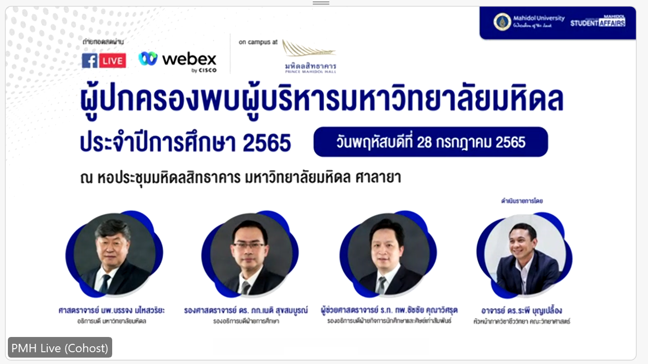 ทั้งนี้ ผู้ปกครองสามารถรับชมวิดีโอ “กิจกรรมผู้ปกครองพบผู้บริหารมหาวิทยาลัย” ประจำปีการศึกษา 2565 ย้อนหลังได้ทางระบบ MUx ที่เว็บไซต์ https://mux.mahidol.ac.th/ ซึ่งมีระยะเวลาเผยแพร่ ถึงวันที่ 31 สิงหาคม 2565 โดยสามารถเข้าใช้งานระบบ MUx ได้ด้วยอีเมลของมหาวิทยาลัยจากนักศึกษาในความดูแลของท่าน (ตัวอย่างอีเมล: ชื่อ.นามสกุล3ตัวแรก@student.mahidol.ac.th)