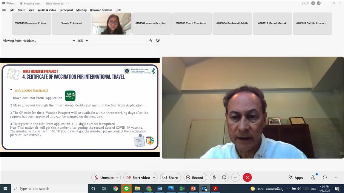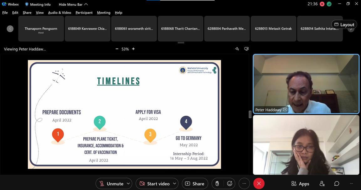 วันที่ 8 เมษายน 2565 คณะเทคโนโลยีสารสนเทศและการสื่อสาร (ICT) มหาวิทยาลัยมหิดล จัดกิจกรรม Online Orientation Session: 2022 Internship at University of Bremen ผ่านระบบออนไลน์ด้วยโปรแกรม Webex Meetings ให้แก่นักศึกษามหาวิทยาลัยมหิดล ที่จะเดินทางไปฝึกประสบการณ์วิชาชีพด้าน ICT ณ University of Bremen ประเทศเยอรมนี จำนวน 18 คน โดยแบ่งออกเป็น นักศึกษาหลักสูตรวิทยาศาสตรบัณฑิต สาขาวิชาเทคโนโลยีสารสนเทศและการสื่อสาร (ICT นานาชาติ) จำนวน 12 คน นักศึกษาหลักสูตรปรัชญาดุษฎีบัณฑิต สาขาวิชาวิทยาการคอมพิวเตอร์ จำนวน 1 คน นักศึกษาจากคณะแพทศาสตร์ศิริราชพยาบาล และคณะเวชศาสตร์เขตร้อน จำนวน 5 คน