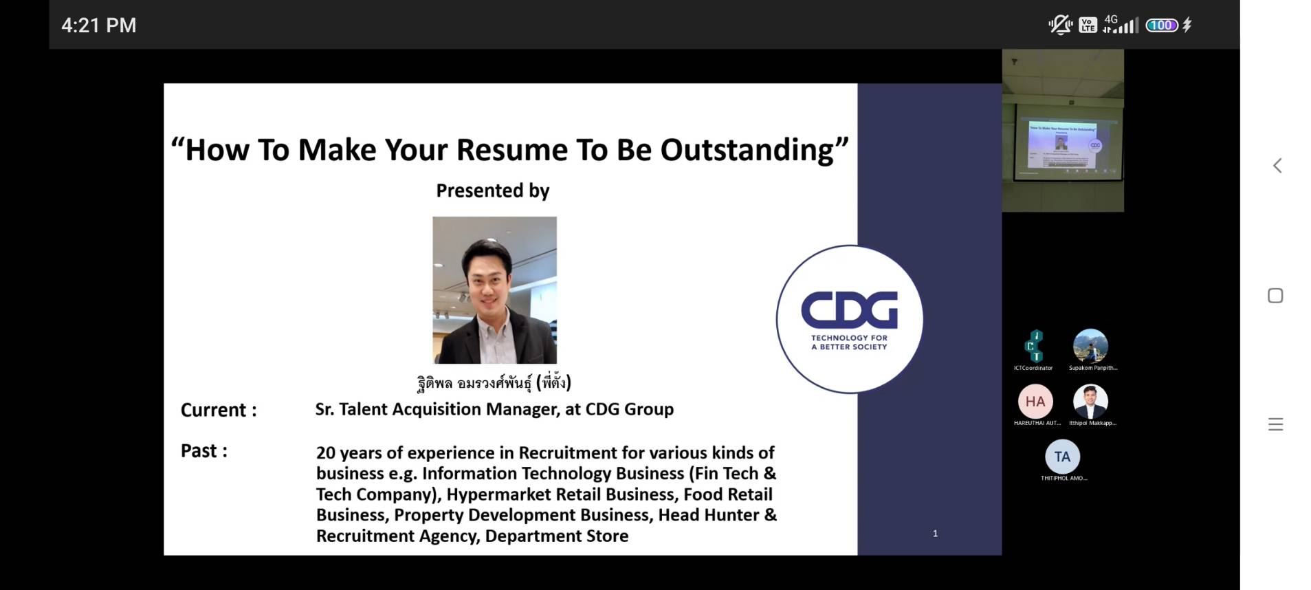 คณะ ICT ม.มหิดล (ICT Mahidol) จัดบรรยายพิเศษในหัวข้อ “การเขียนประวัติการทำงาน Resume Online” มกราคม 20, 2023มกราคม 20, 2023 วันที่ 20 มกราคม 2566 คณะเทคโนโลยีสารสนเทศและการสื่อสาร มหาวิทยาลัยมหิดล (ICT Mahidol) นำโดย รองศาสตราจารย์ ดร.สุดสงวน งามสุริยโรจน์ อาจารย์ประจำรายวิชา ทสวด 201 โจทย์และประสบการณ์ทางอุตสาหกรรม 2 (ITDS201 Industry Problems and Experiences 2) จัดบรรยายพิเศษในหัวข้อ “การเขียนประวัติการทำงาน Resume Online” โดยได้รับเกียรติจาก คุณฐิติพล อมรวงศ์พันธุ์ บริษัท CDG Group เป็นวิทยากรถ่ายทอดความรู้และเทคนิคการเขียนประวัติการทำงาน (Resume) ในรูปแบบ Online Resume ให้แก่นักศึกษาหลักสูตรวิทยาศาสตรบัณฑิต สาขาวิชาวิทยาการและเทคโนโลยีดิจิทัล (DST หลักสูตรไทย) ชั้นปีที่ 2 ณ ห้อง IT332 และ ในรูปแบบออนไลน์ ผ่านโปรแกรม Microsoft Teams Previous Next ดาวน์โหลดข่าว