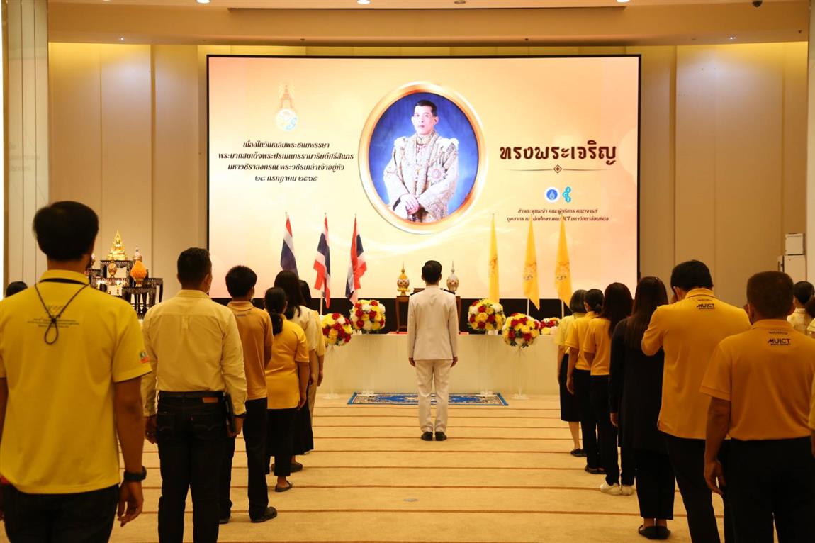 วันที่ 27 กรกฎาคม 2565 คณะเทคโนโลยีสารสนเทศและการสื่อสาร (ICT) มหาวิทยาลัยมหิดล จัด “พิธีถวายพระพรชัยมงคลถวายราชสดุดีเฉลิมพระเกียรติสมเด็จพระเจ้าอยู่หัวมหาวชิราลงกรณบดินทร เทพยวรางกูร เนื่องในโอกาสวันเฉลิมพระชนมพรรษา 70 พรรษา” เพื่อแสดงความจงรักภักดีและน้อมสำนึกในพระมหากรุณาธิคุณ โดยได้รับเกียรติจาก ดร.พัฒนศักดิ์ มงคลวัฒน์ คณบดี เป็นประธานในพิธีฯ พร้อมด้วยคณะผู้บริหาร คณาจารย์ และบุคลากร พร้อมใจกันแต่งกายในโทนสีเหลือง เข้าร่วมพิธีถวายพระพรชัยมงคล โดยมี ดร.ปวิตรา เลี่ยมรักษ์ รองคณบดีฝ่ายบริหารการศึกษา และรักษาการแทนรองคณบดีฝ่ายสื่อสารองค์กรและสร้างความผูกพัน กล่าวรายงาน จากนั้น ดร.พัฒนศักดิ์ มงคลวัฒน์ คณบดี กล่าวราชสดุดีเฉลิมพระเกียรติถวายพระพรชัยมงคล เปิดกรวยกระทงดอกไม้ ถวายสักการะ ถวายความเคารพพระบรมฉายาลักษณ์ ร้องเพลงสรรเสริญพระบารมี และลงนามถวายพระพร ณ ห้อง Grand Auditorium ชั้น 4 คณะ ICT มหาวิทยาลัยมหิดล ศาลายา และในรูปแบบออนไลน์ผ่านโปรแกรม Webex Meetings