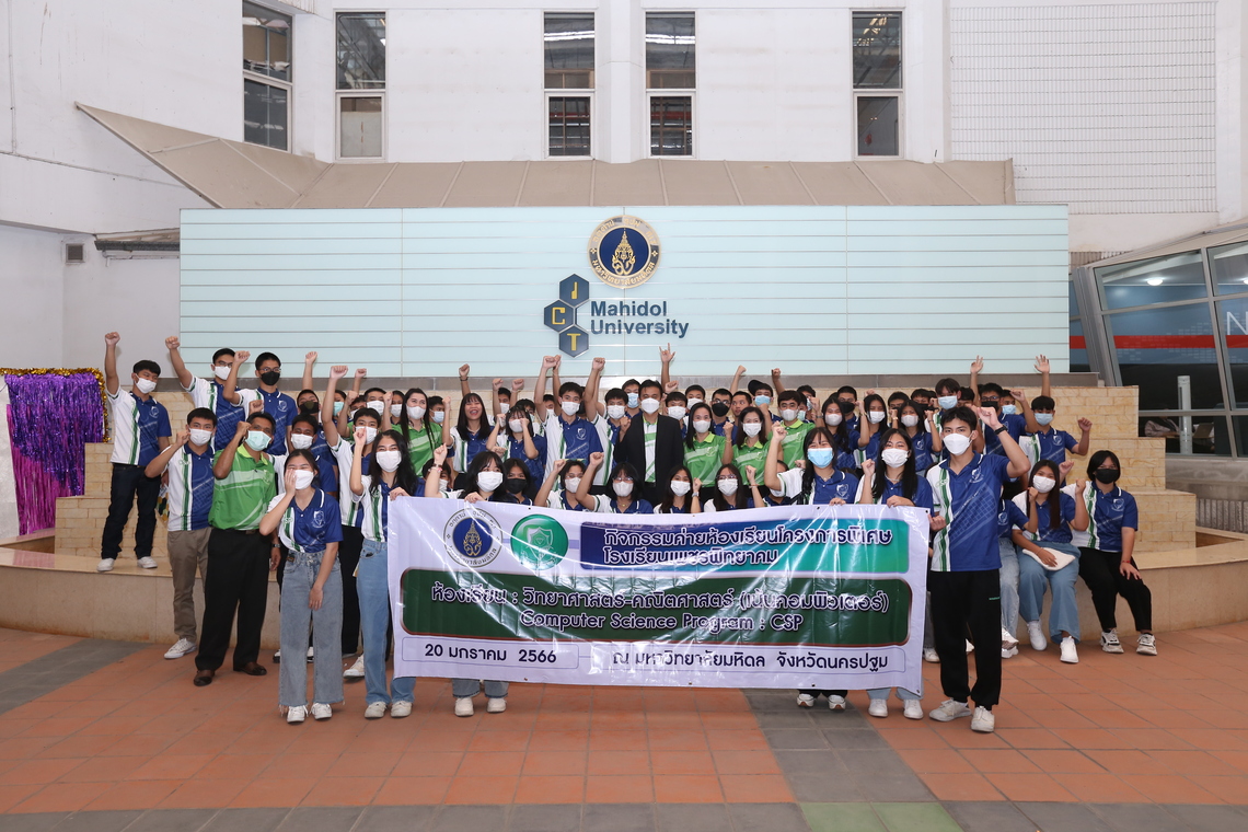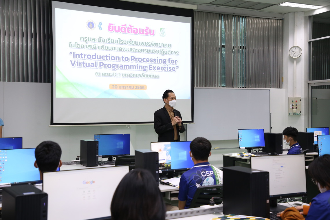 วันที่ 20 มกราคม 2566 ดร.พัฒนศักดิ์ มงคลวัฒน์ คณบดี คณะเทคโนโลยีสารสนเทศและการสื่อสาร มหาวิทยาลัยมหิดล (ICT Mahidol) ให้การต้อนรับ อาจารย์นิรุทธ์ แก้วนิคม รองผู้อำนวยการ พร้อมด้วยคณะครูและนักเรียนชั้นมัธยมศึกษาปีที่ 4 – 5 โรงเรียนเพชรพิทยาคม จ.เพชรบูรณ์ จำนวนกว่า 70 คน ในโอกาสเข้าเยี่ยมชมและอบรมเชิงปฏิบัติการด้าน IT โดยมี ดร.พิสิฐ ไพรวัฒนา ผู้ช่วยคณบดีฝ่ายสื่อสารองค์กรและเทคโนโลยีสื่อ เป็นวิทยากรอบรมเชิงปฏิบัติการในหัวข้อ “Introduction to Processing for Virtual Programming Exercise” พร้อมทั้งแนะแนวหลักสูตรการเรียนการสอนของคณะฯ ณ ห้องปฏิบัติการคอมพิวเตอร์ Lab 105 คณะ ICT มหาวิทยาลัยมหิดล ศาลายา