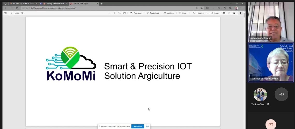 วันที่ 24 มีนาคม 2565 คณะเทคโนโลยีสารสนเทศและการสื่อสาร (ICT) มหาวิทยาลัยมหิดล นำโดย รศ. ดร. สุดสงวน งามสุริยโรจน์ พร้อมด้วย ผศ. ดร. ฐิตินันท์ ตันติธรรม อาจารย์ประจำคณะเทคโนโลยีสารสนเทศและการสื่อสาร จัดบรรยายพิเศษในหัวข้อ “Smart & Precision IoT Solution Agriculture” โดยได้รับเกียรติจาก คุณสว่างพงษ์ หมวดเพชร เจ้าของธุรกิจ Komomi Co., Ltd. ซึ่งเป็นธุรกิจที่เกี่ยวกับการผลิตกล่องควบคุมการเพาะปลูกพืช ที่ทำงานควบคู่กับ Application บนสมาร์ทโฟน เป็นวิทยากรผู้เชี่ยวชาญและมีความรู้เชิงลึกในการทำเกษตรอัจฉริยะ มาบรรยายเกี่ยวกับการนำเทคโนโลยี IoT มาประยุกต์ใช้ในการทำการเกษตร ให้กับนักศึกษาระดับปริญญาตรี ชั้นปีที่ 1 หลักสูตรวิทยาศาสตรบัณฑิต สาขาวิทยาการและเทคโนโลยีดิจิทัล (DST) คณะเทคโนโลยีสารสนเทศและการสื่อสาร ประจำภาคการศึกษาที่ 2 ปีการศึกษา 2564 ในรูปแบบออนไลน์ ผ่านโปรแกรม Microsoft Teams