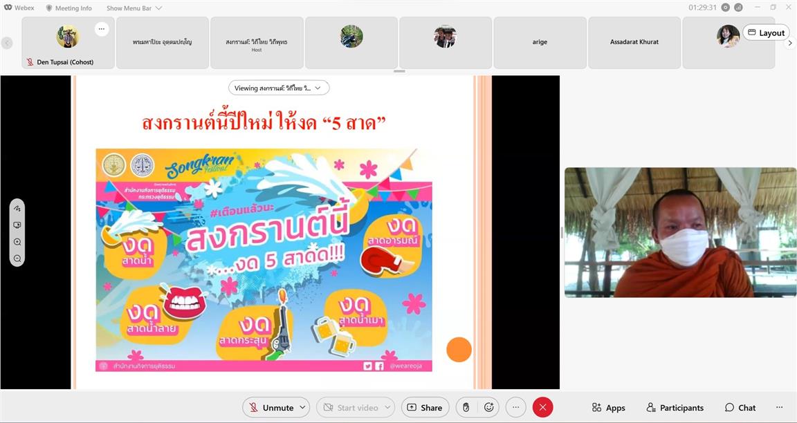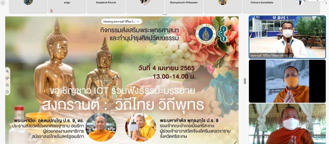 วันที่ 4 เมษายน 2565 คณะเทคโนโลยีสารสนเทศและการสื่อสาร (ICT) มหาวิทยาลัยมหิดล นำโดยคณะทำงานทำนุบำรุงศิลปวัฒนธรรมและส่งเสริมการมีส่วนร่วมกับชุมชน จัดกิจกรรมฟังธรรมะบรรยาย เนื่องในวันสงกรานต์ หัวข้อ “สงกรานต์ : วิถีไทย วิถีพุทธ” โดยมี พระมหาคำตัล พุทฺธงฺกุโร ป.ธ. 9 รองเจ้าคณะอำเภอเมืองศรีสะเกษ ผู้ช่วยเจ้าอาวาสวัดเจียงอีศรีมงคลวราราม จังหวัดศรีสะเกษ และพระมหาปิยะ อุตฺตมปญฺโญ ป.ธ. 9 ดร. ประธานสงฆ์วัดโปรดเกศเชษฐาราม ประเทศสหรัฐอเมริกา ผู้ช่วยกองงานเลขาธิการสมัชชาสงฆ์ไทยในประเทศสหรัฐอเมริกา บรรยายธรรมะในรูปแบบออนไลน์ผ่านโปรแกรม Webex Meetings ให้แก่ผู้บริหาร คณาจารย์ และบุคลากร เพื่อเป็นการสืบสานประเพณีอันดีงามของไทย