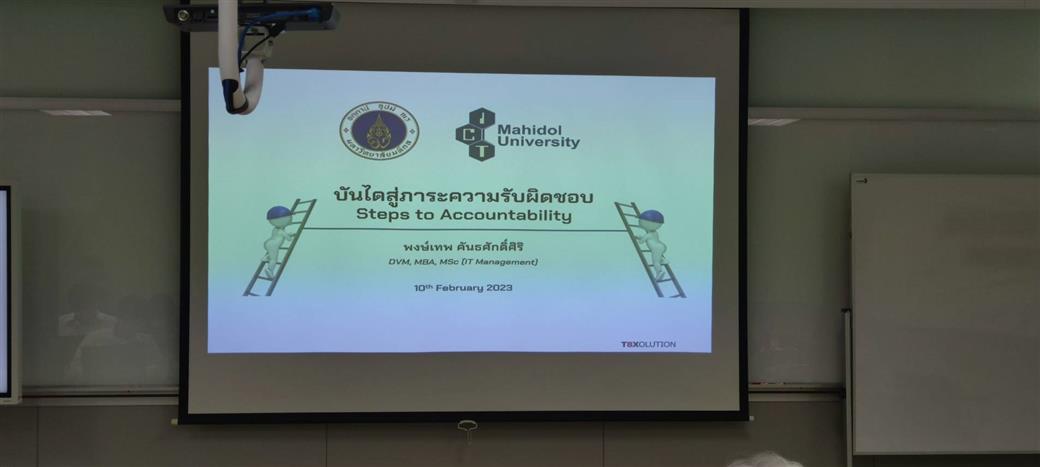 วันที่ 10 กุมภาพันธ์ 2566 คณะเทคโนโลยีสารสนเทศและการสื่อสาร มหาวิทยาลัยมหิดล (ICT Mahidol) นำโดย รองศาสตราจารย์ ดร. สุดสงวน งามสุริยโรจน์ อาจารย์ประจำรายวิชา ทสวด 201 โจทย์และประสบการณ์ทางอุตสาหกรรม 2 (ITDS201 Industry Problems and Experiences 2) จัดบรรยายพิเศษในหัวข้อ “บันไดสู่ความรับผิดชอบ: Steps to Accountability” โดยได้รับเกียรติจาก นายสัตวแพทย์พงษ์เทพ คันธศักดิ์ศิริ Advisor, Department of International Business, Nisseiken Company และ Freelance Consultancy Services for T8XOLUTION เป็นวิทยากรถ่ายทอดความรู้และแชร์ประสบการณ์เกี่ยวกับภาระหน้าที่ความรับผิดชอบในการดำเนินธุรกิจ ทั้งต่อตนเองและต่อวิชาชีพ ให้แก่นักศึกษาหลักสูตรวิทยาศาสตรบัณฑิต สาขาวิทยาการและเทคโนโลยีดิจิทัล (DST หลักสูตรไทย) ชั้นปีที่ 2 ณ ห้อง IT332 คณะ ICT มหาวิทยาลัยมหิดล ศาลายา