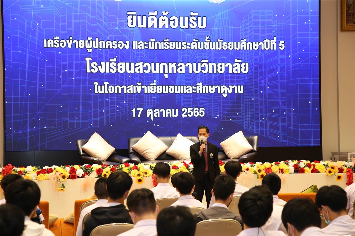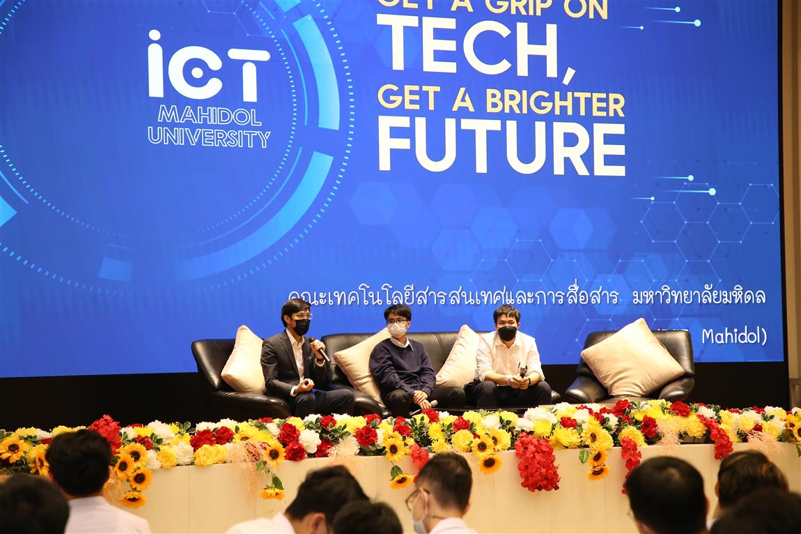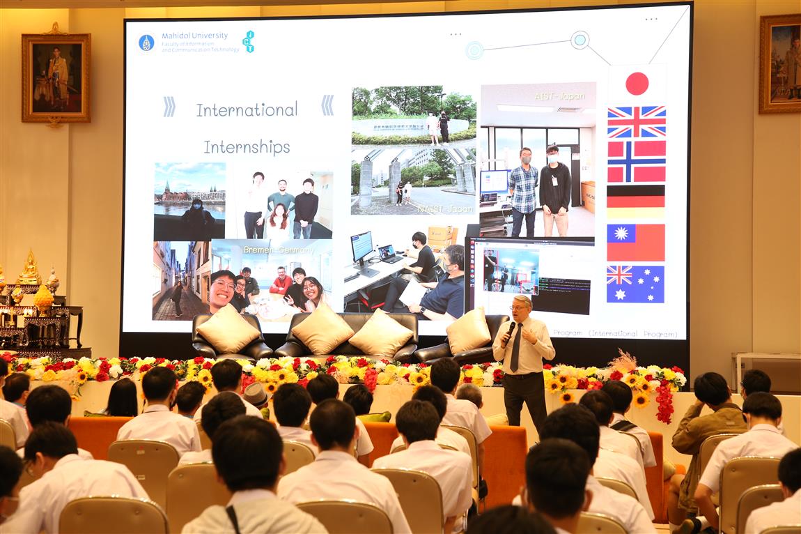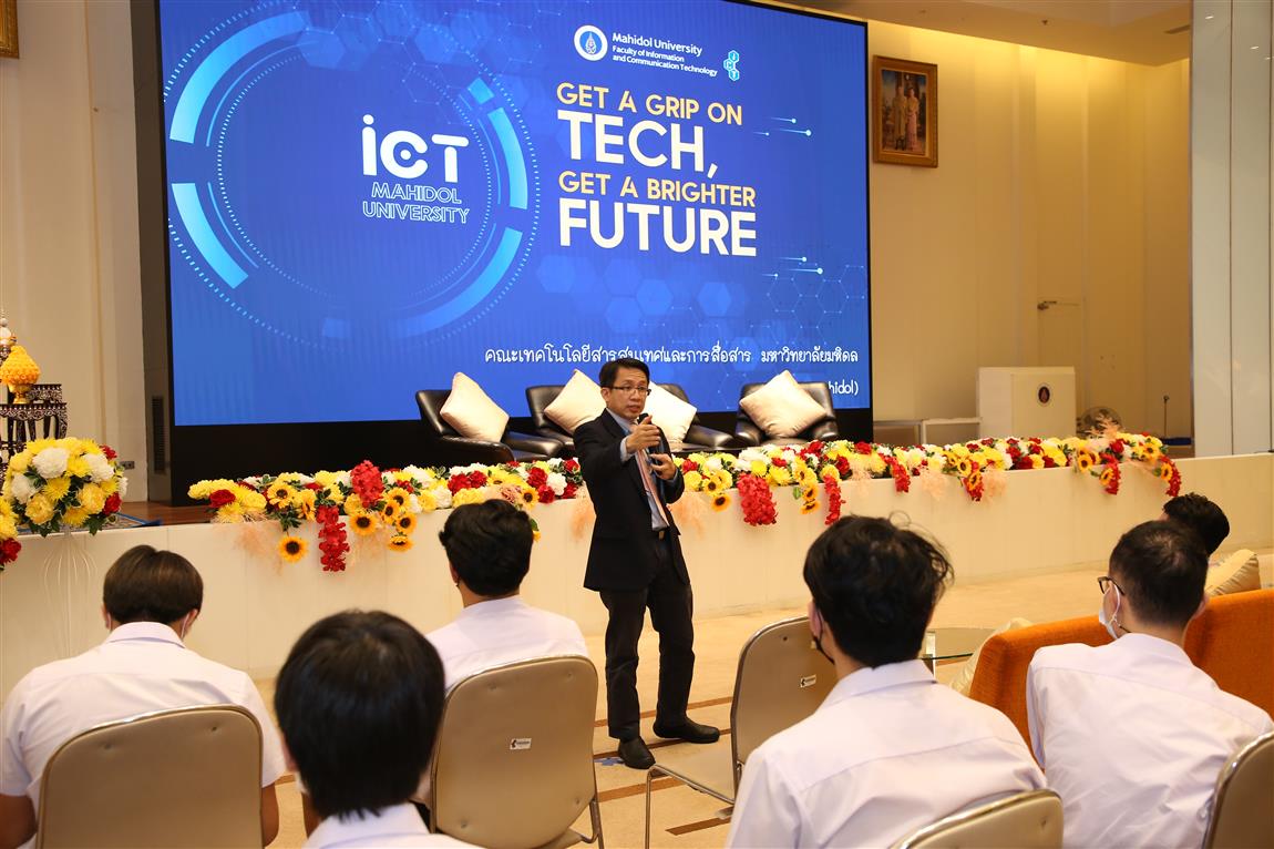 วันที่ 17 ตุลาคม 2565 คณะเทคโนโลยีสารสนเทศและการสื่อสาร (ICT) มหาวิทยาลัยมหิดล ให้การต้อนรับเครือข่ายผู้ปกครอง และนักเรียนระดับชั้นมัธยมศึกษาปีที่ 5 โรงเรียนสวนกุหลาบวิทยาลัย ในโอกาสเข้าเยี่ยมชม คณะ ICT มหาวิทยาลัยมหิดล โดยได้รับเกียรติจาก ดร.พัฒนศักดิ์ มงคลวัฒน์ คณบดี กล่าวต้อนรับเครือข่ายผู้ปกครอง และนักเรียน พร้อมด้วย ผู้ช่วยศาสตราจารย์ ดร.ชาญยศ ปลื้มปิติวิริยะเวช อาจารย์ประจำกลุ่มวิชาวิทยาการคอมพิวเตอร์ แนะนำหลักสูตรวิทยาศาสตรบัณฑิต สาขาเทคโนโลยีสารสนเทศและการสื่อสาร (ICT หลักสูตรนานาชาติ) และสาขาวิทยาการและเทคโนโลยีดิจิทัล (DST หลักสูตรไทย) นอกจากนี้ ยังได้รับเกียรติจาก ดร.เพชร สัจจชลพันธ์ ผู้ช่วยคณบดีฝ่ายบริหารทรัพยากรบุคคล ชี้แจงรายละเอียดเกี่ยวกับการรับสมัครนักศึกษาใหม่ Mr. Stephen Edward Smith, Student and Alumni Engagement บรรยายในหัวข้อ Student Activities & International Opportunities และปิดท้ายด้วยการพูดคุยแลกเปลี่ยนประสบการณ์การเรียนที่คณะ ICT โดยรุ่นพี่ศิษย์เก่าโรงเรียนสวนกุหลาบวิทยาลัย ได้แก่ ดร.เพชร สัจจชลพันธ์ นายธรรณธร ทองสุข และนายอรุษ เทียนมี นักศึกษาหลักสูตรวิทยาศาสตรบัณฑิต สาขาวิชาเทคโนโลยีสารสนเทศและการสื่อสาร (ICT หลักสูตรนานาชาติ) ชั้นปีที่ 1 ณ ห้อง Grand Auditorium ชั้น 4 คณะ ICT มหาวิทยาลัยมหิดล