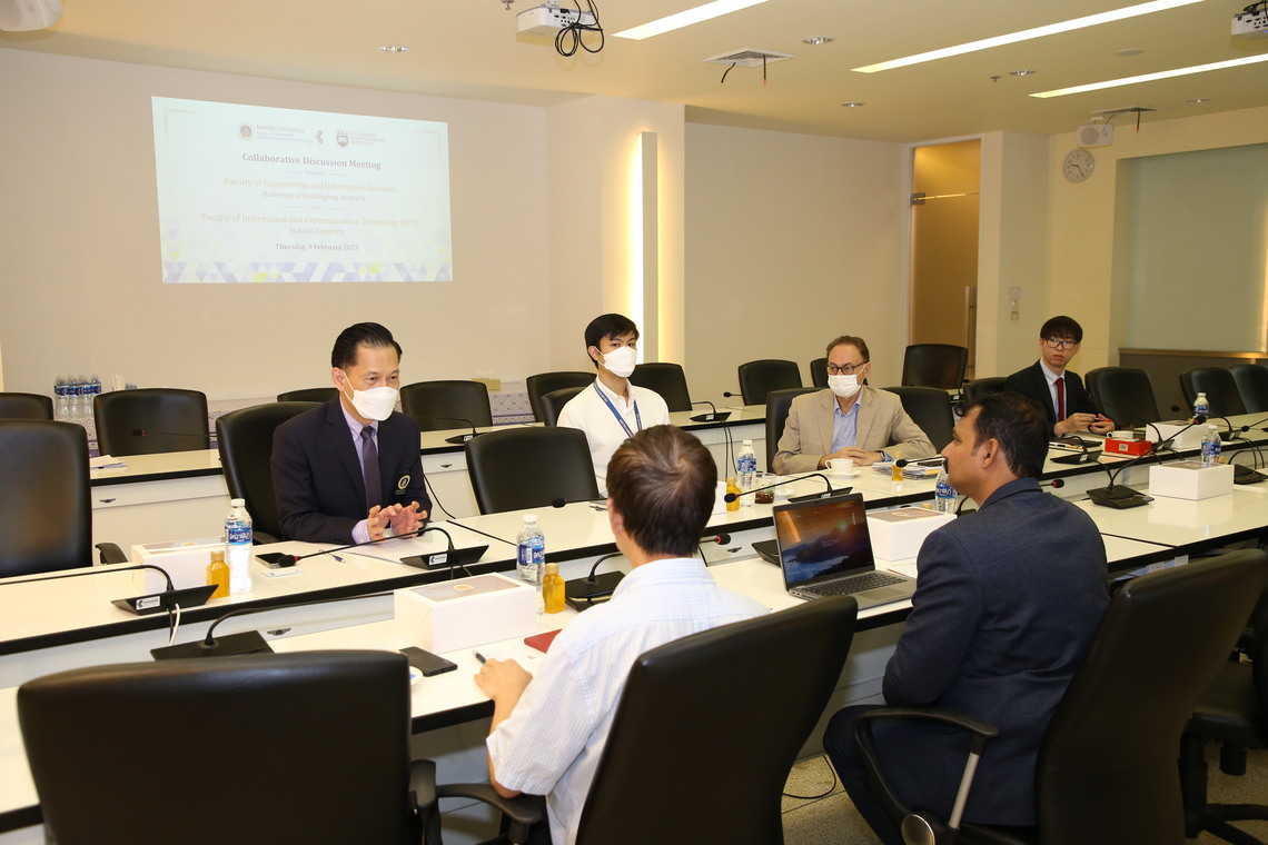 วันที่ 9 กุมภาพันธ์ 2566 ดร.พัฒนศักดิ์ มงคลวัฒน์ คณบดี คณะเทคโนโลยีสารสนเทศและการสื่อสาร มหาวิทยาลัยมหิดล (ICT Mahidol) พร้อมด้วย Prof. Dr. Peter Haddawy รองคณบดีฝ่ายวิจัย ดร.พิสิฐ ไพรวัฒนา ผู้ช่วยคณบดีฝ่ายสื่อสารองค์กรและเทคโนโลยีสื่อ และ ดร.ธนพล นรเสฏฐ์ ผู้ช่วยคณบดีฝ่ายการศึกษา ให้การต้อนรับ Prof. Jiangtao Xi, Associate Dean Global Engagement และ Mr. Saravanan (Saran) Nagarathinam, International Partnerships Manager จาก Faculty of Engineering and Information Sciences, University of Wollongong เครือรัฐออสเตรเลีย ในโอกาสเข้าเยี่ยมเยียน และหารือความร่วมมือด้านวิชาการ เกี่ยวกับการจัดทำหลักสูตรสองปริญญา (Joint/Double Degree) การเทียบโอนหน่วยกิต และความร่วมมือในด้านวิศวกรรมศาสตร์และวิทยาการสารสนเทศร่วมกัน ณ ห้อง IT 404 คณะ ICT มหาวิทยาลัยมหิดล ศาลายา