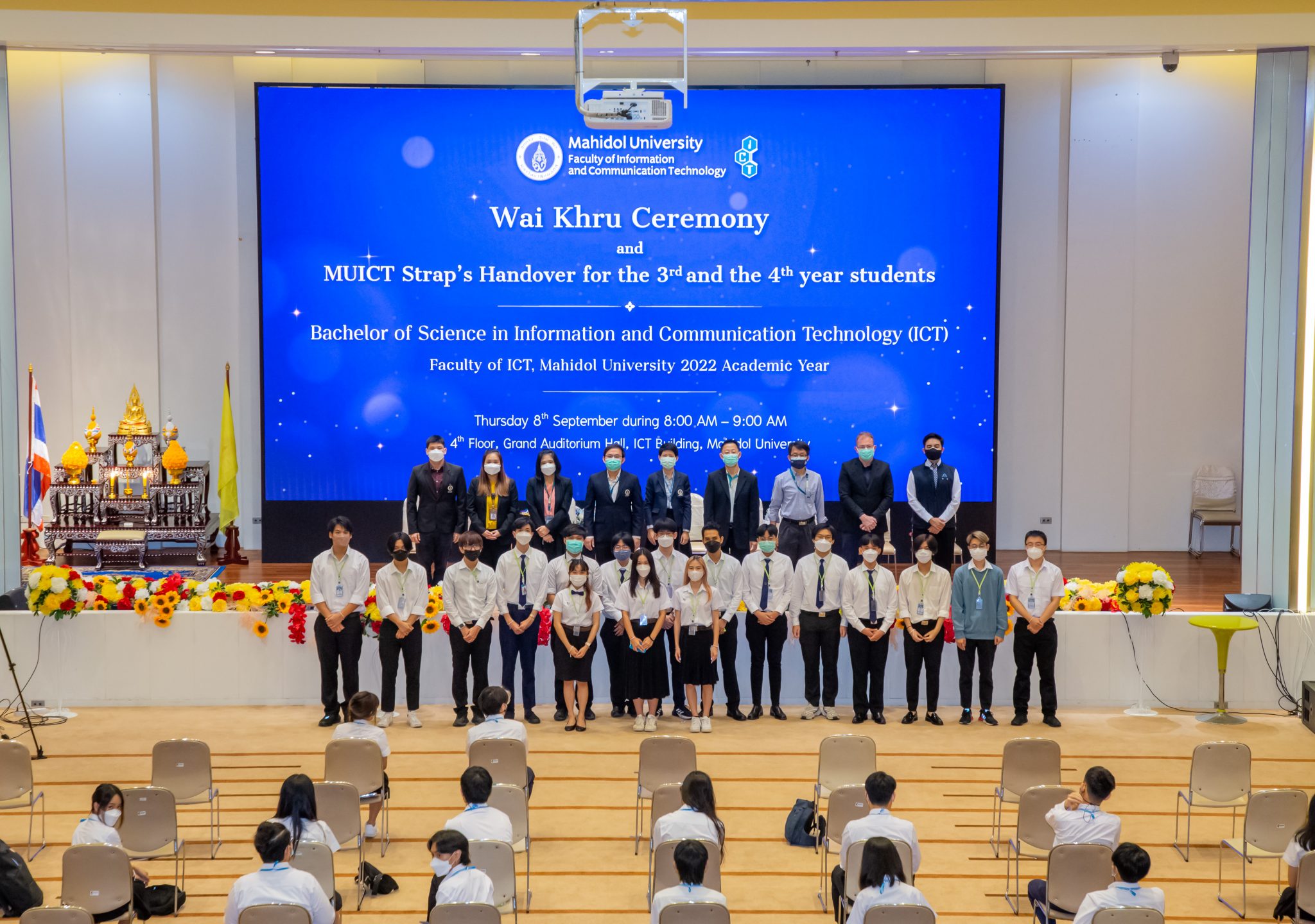 On 8 September 2022 – the Faculty of Information and Communication Technology, Mahidol University (ICT Mahidol), organized “Wai Kru and Strap Presentation Ceremony, Academic Year 2022” for 3rd and 4th year students of its B. Sc. in Information and Communication Technology (ICT International Program). On this occasion, Dr. Pawitra Liamruk, Deputy Dean for Academic Administration and Acting Deputy Dean for Organizational Communication and Engagement, as a representative of the Dean, presided over the ceremony which was attended by many ICT Mahidol instructors, executives and students at the Grand Auditorium, 4th floor, ICT Building, Salaya Campus, as well as via Webex Meetings.